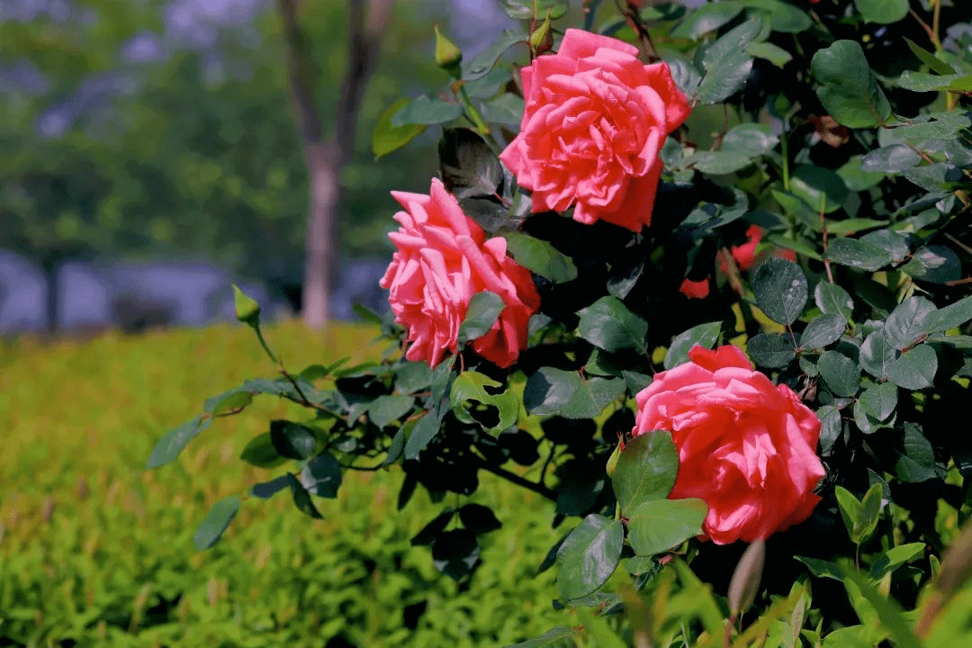 除了花开成海的木香,园内五颜六色、品种繁多的月季也逐渐进入盛花期,有的如红宝石般闪耀;有的硕大美丽,宛如孩子的笑脸;有的粉白相间、惹人怜爱。