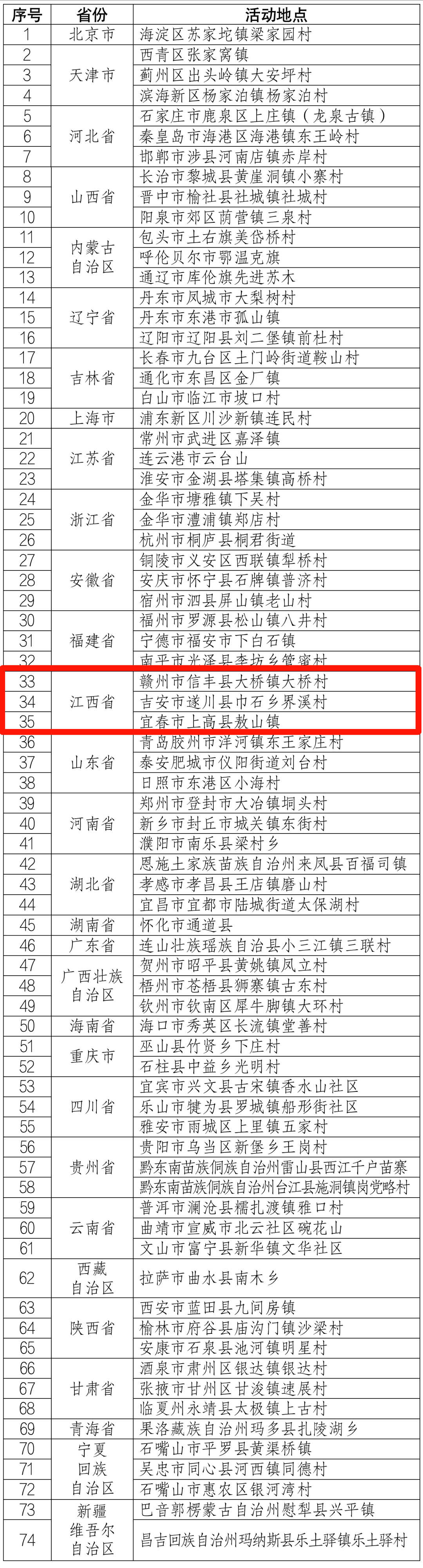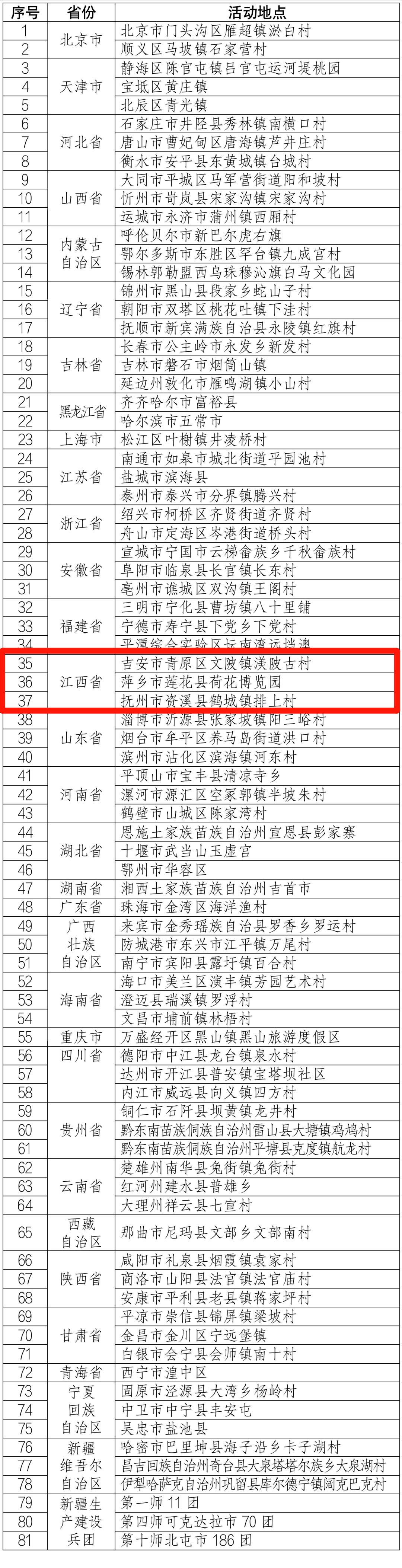 根据《文化和旅游部办公厅关于开展“四季村晚”活动的通知》要求,文化和旅游部公共服务司在各省级文化和旅游行政部门申报推荐的基础上,经研究,确定春季“村晚”主会场设在四川省宜宾市、夏季“村晚”主会场设在云南省丽江市、秋季“村晚”主会场设在江西省九江市、冬季“村晚”主会场设在浙江省丽水市、广西壮族自治区柳州市,并确定了“四季村晚”示范展示点名单,现予以公布。