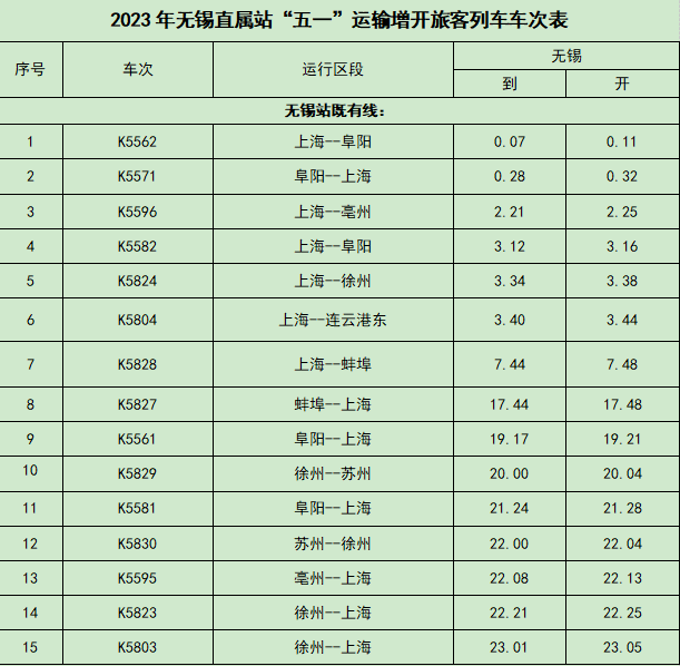 为满足旅客出行需要,无锡火车站在图定高峰线的基础上,进一步优化列车开行方案,在“五一”期间计划增开办客旅客列车45列,主要集中于上海、徐州、连云港、阜阳等管内方向;其中无锡站既有线新增15列,沪宁线新增22列,无锡东站京沪高铁线新增8列,具体车次及开行情况以12306网站和车站公告为准。