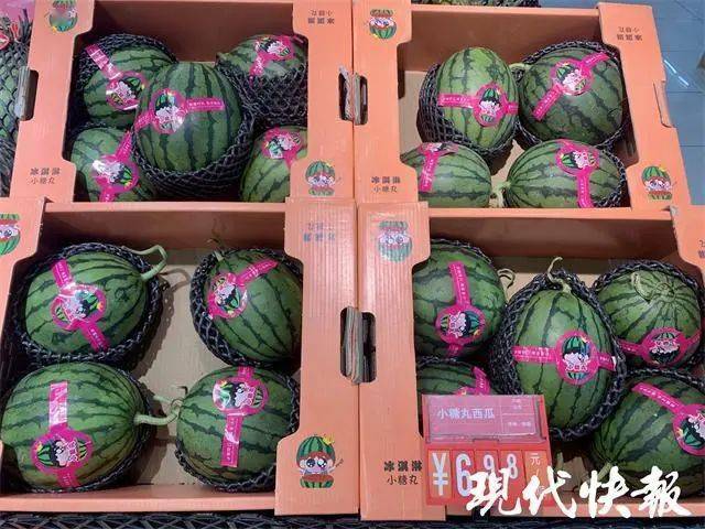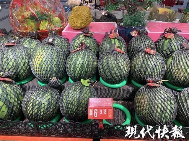 在秦淮区永乐路上的一家连锁商超内,入口处摆满了圆滚滚的麒麟西瓜,价格为 6.98 元一斤,果切区还有对半切开的西瓜。“都是刚切出来的,很新鲜,一切就炸。”有市民挑选了半个麒麟西瓜,称重为 4 斤左右,价格是 28.1 元。工作人员说,这些麒麟瓜产自海南,个头较大,如果吃不下,可以买旁边产自山东的“小糖丸” 西瓜。上周要八九元一斤,这两天降到 6.98 元一斤,皮薄汁多,几乎只有巴掌大,很受大家的欢迎。