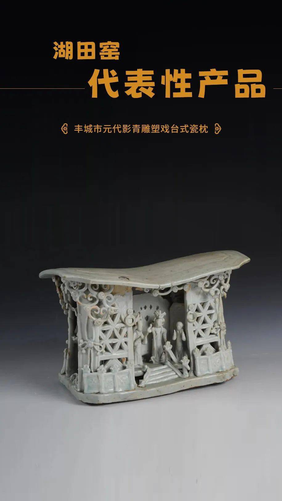 枕身雕塑成一座仿木结构的彩棚戏台,演出场面为传统戏曲“白蛇传”中的场景,是景德镇湖田窑元代戏曲人物枕代表性产品之一。
