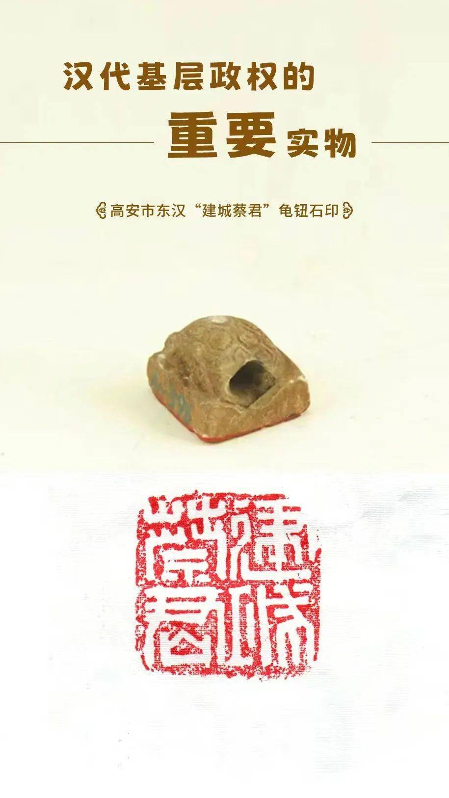 方形印台,上伏龟钮,双行四字“建成蔡君”。该印为我们研究封建制度、高安历史沿革、汉代文化提供了实物资料。