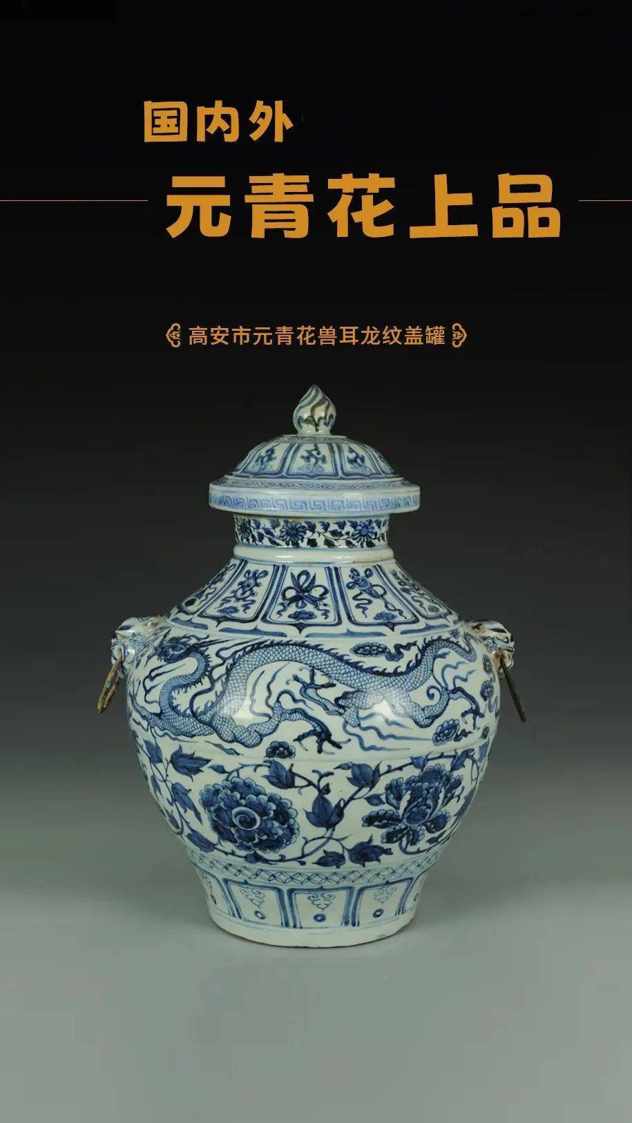 该罐借鉴大门铺首的造型贴塑于罐身,纹饰繁密多达12层,属典型的至正型元青花的装饰风格,为国内外元青花中的上品。