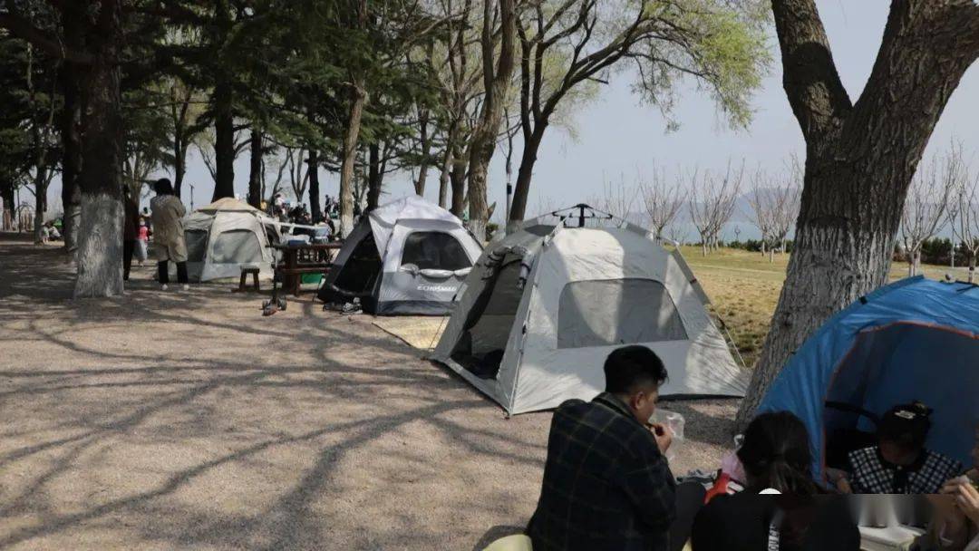 周末,在里口山景区滨河公园、羊亭公园二期,一顶顶帐篷、一块块野餐垫、一把把露营椅被摆放在草坪上,年轻情侣彼此倚靠,三五好友分享着美食,充满欢声笑语……