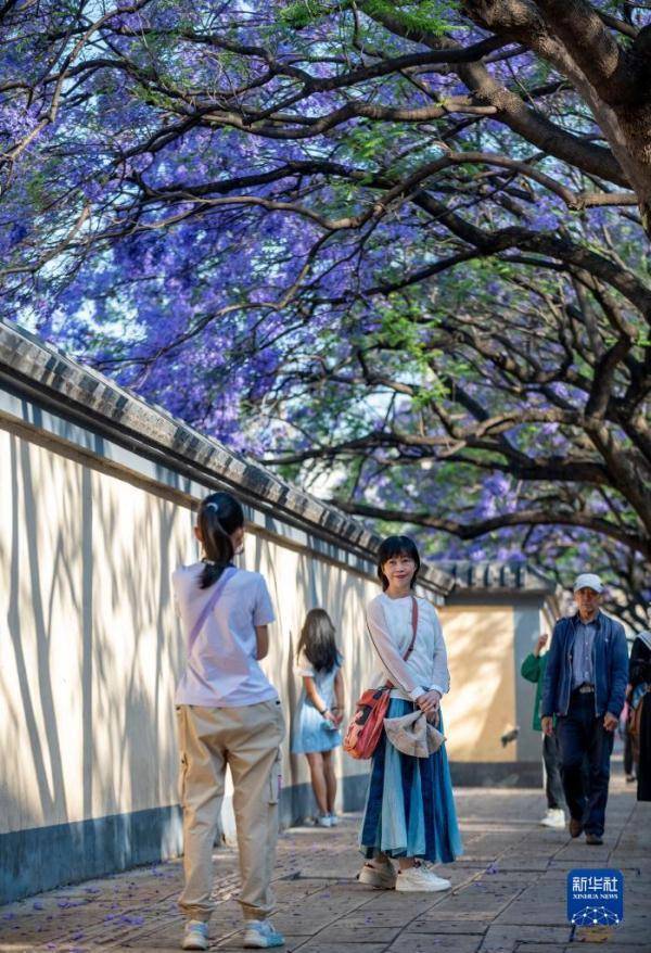 近日,位于云南省昆明市教场中路的蓝花楹绽放,吸引市民和游客前来拍照打卡。