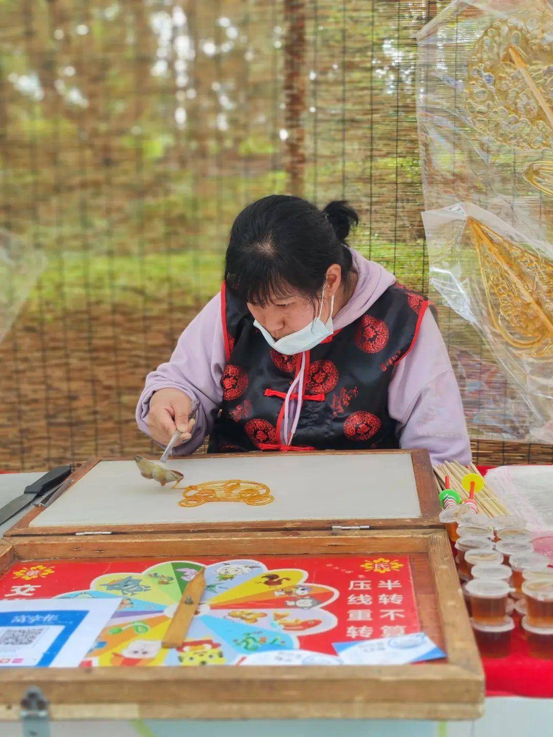 非遗手工艺品定制展区,手工艺传人将根据游客的个性化需求进行现场创作,如糖画勾勒爱心、花束,面塑捏制梁山伯祝英台、鸳鸯、玫瑰花,脸谱绘制专属情侣面具等,还有深受小朋友们喜爱的动漫形象……
