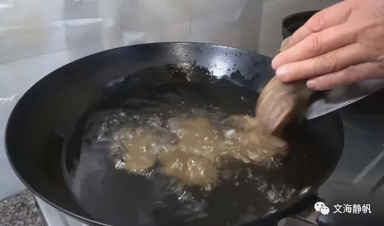 第二步,把猪花油平铺开,将拌好的原料放置上面,用猪花油裹成直径约3厘米,长约25厘米的圆条,随即迅速放入热油中煎至柿黄色取出。这就是初成模型的烧肝。