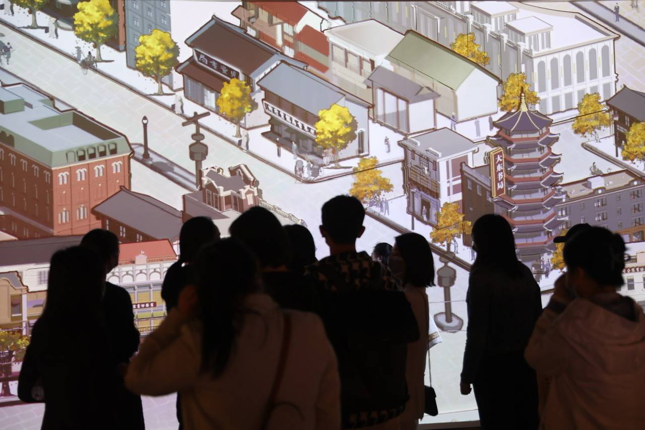 走进展馆序厅,裸眼3D技术展开新闻出版历史的长卷,与两侧顶天立地的报头、刊头LOGO墙营造出文化殿堂的氛围。一虚一实,让人身临其境。主题馆用巨型大屏还原上世纪二三十年代以福州路、山东中路为中心的书馆、报馆一条街。参观者扫描二维码,可一键穿越回书报一条街,操作虚拟人物完成任务,感受当时的文化盛况。