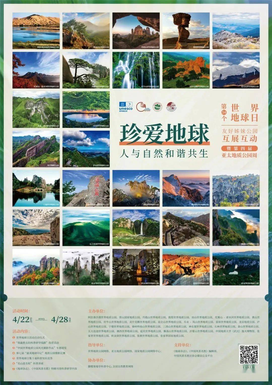 为做好今年世界地球日科普宣传活动,加强姊妹公园宣传联动和科普互动,展示世界地质公园保护和发展成果,泰山等29家地质公园和中国地质大学(武汉)逸夫博物馆联合发起以“珍爱地球 人与自然和谐共生”为主题的第54个世界地球日“友好姊妹公园互展互动”活动暨第4届亚太地质公园周宣传活动。