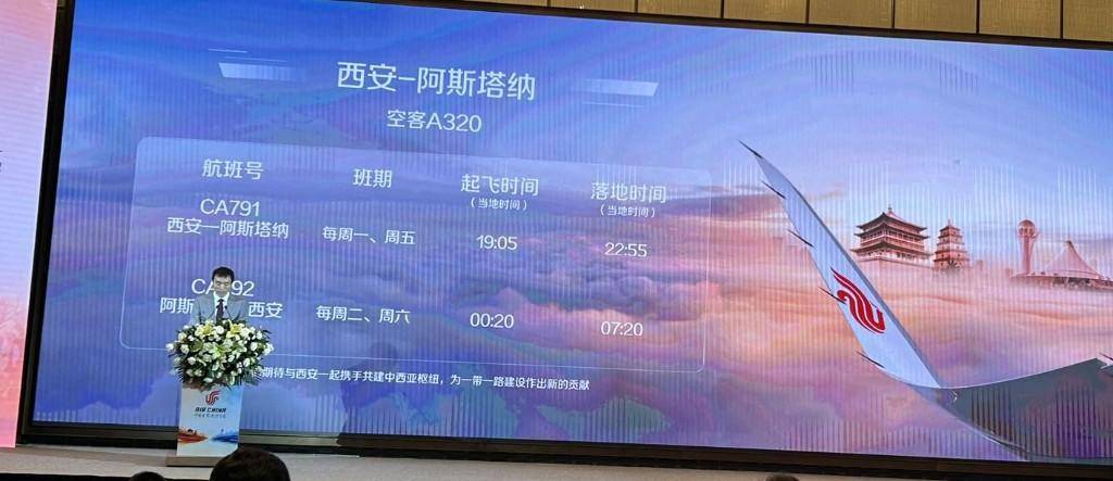 据介绍,当晚19时19分,首航航班从西安咸阳国际机场启程前往阿斯塔纳。西安-阿斯塔纳航线是国航在西安开通的首条赴哈萨克斯坦定期远程国际航线,机型为空客A320,航班号为CA791,每周两班,每周一、五(起飞时间19:05),从西安飞往阿斯塔纳。