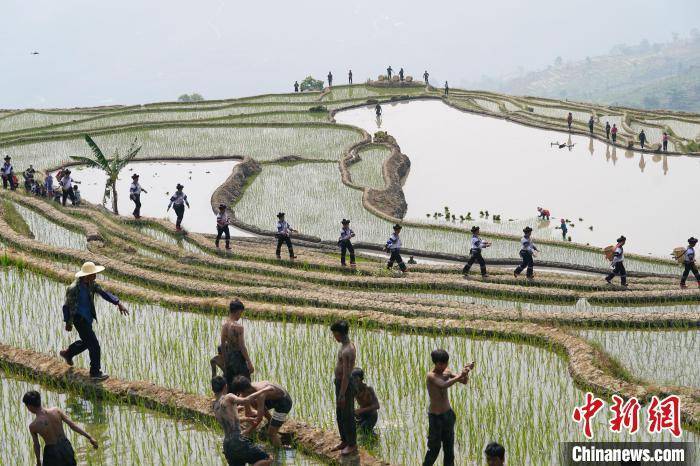 随着号角响起,祭司带领随祭人员穿行在梯田埂上,向田中抛洒米粒,大典正式开始。仪式现场,哈尼族民众跟随鼓点唱起歌、“串田人”跳起猴子舞、少年们打着泥巴架……场面十分热闹,多地游客现场观礼。