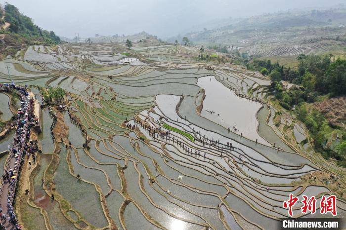 中新网红河4月22日电(洪沂) 22日,云南省红河哈尼族彝族自治州红河县撒玛坝万亩梯田景区举行“开秧门”祭祖大典,通过哈尼族民众实景表演的各色民俗活动,充分展现哈尼梯田农耕文化。