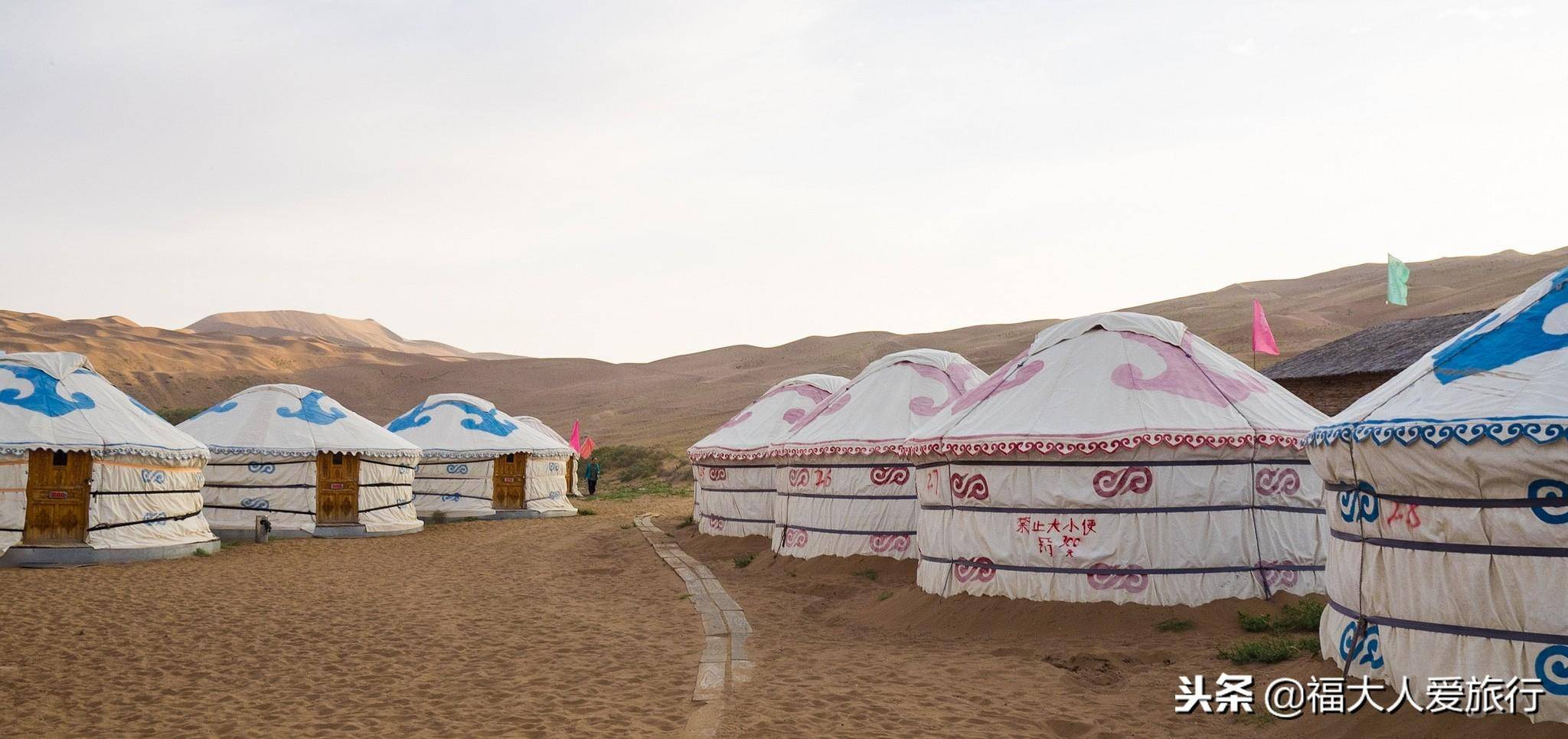 远眺了必鲁图峰,欣赏了沙漠神泉音图日德泉水后,越野车继续前行。在爬上一个高耸的沙丘后,车辆俯冲下一个更长的沙坡。大家在惊心动魄之际,一个湖泊和边上的村落便显现了出来,这就是我们今晚的宿营地——巴丹吉林嘎查。蒙语里嘎查就是村庄的意思,位于沙漠腹地的巴丹吉林嘎查说是村落,其实也只有七八间房屋,外加专为游客们住宿搭建的两排蒙古包。