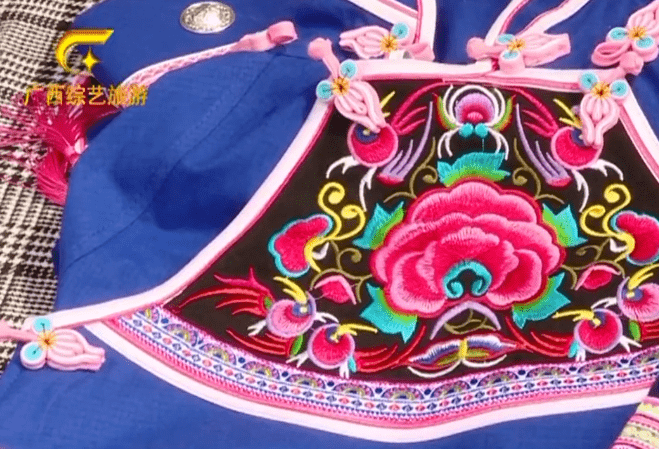 这个八角花寓意丰收,寓意着我们幸福的果实,寓意我们壮家儿女幸福的生活,准确来说这块壮锦需要5个绣娘,再加上3个月左右的绣制,才能绣出来这么一大幅。