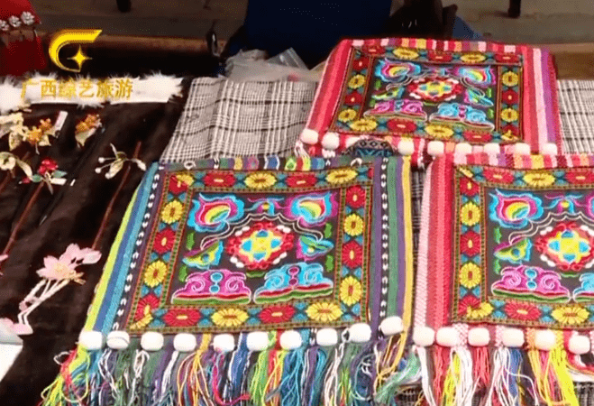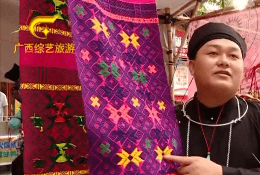 除了民族乐器,花纹繁复,色彩斑斓的壮锦也是吸引游客的不二法门。
