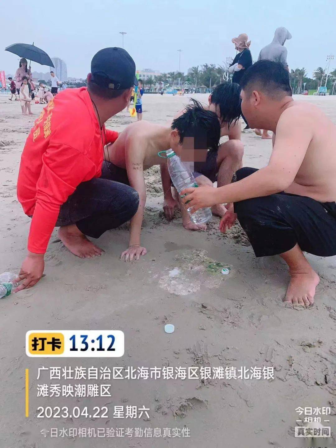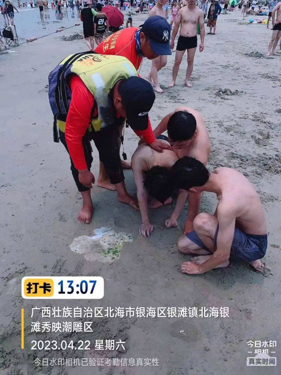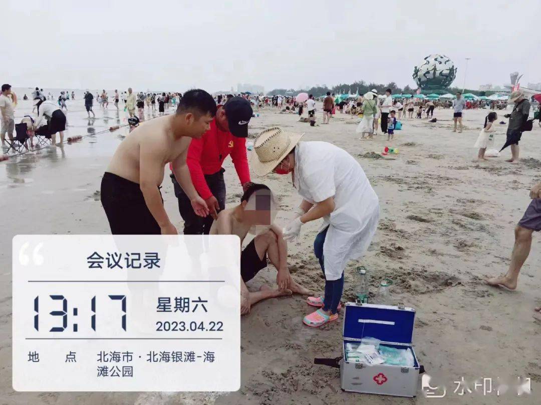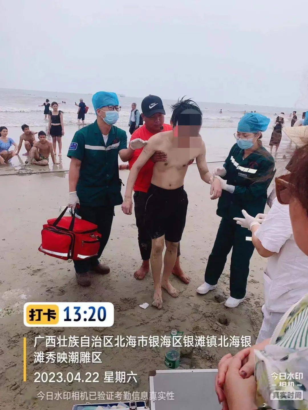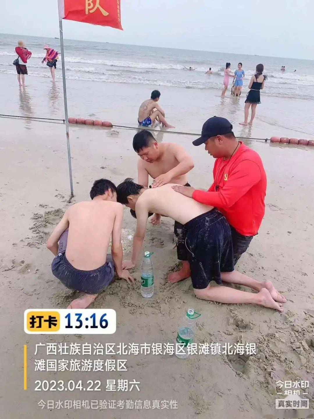 4月22日下午13时,银滩景区一名游客被大浪卷进深水区,幸得巡视在此的银滩景区救生队员相救,才将其从死亡线上拉了回来。