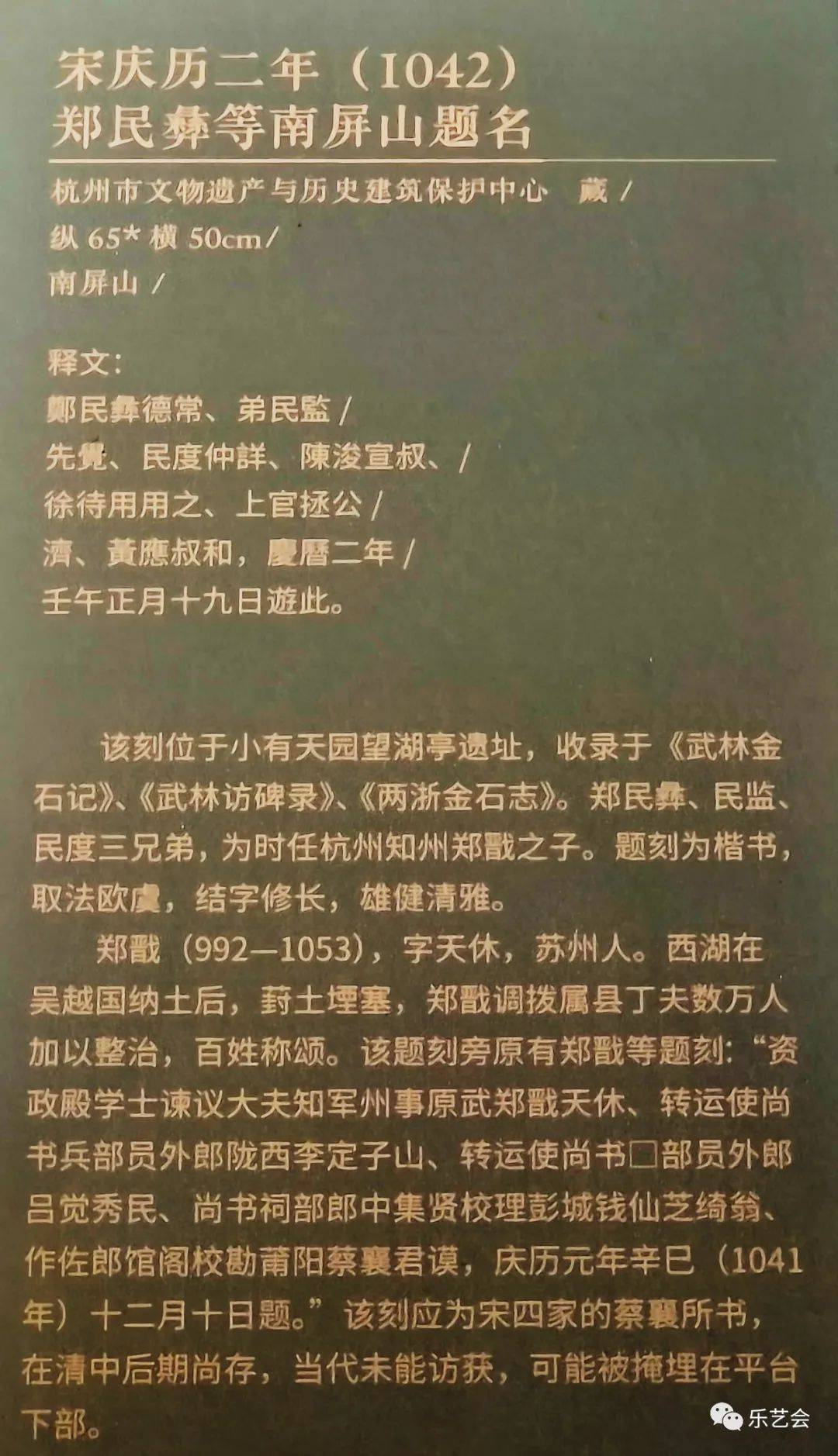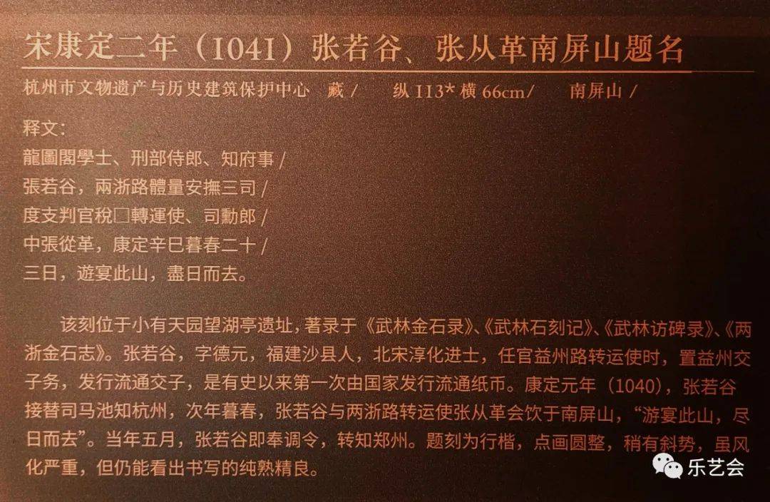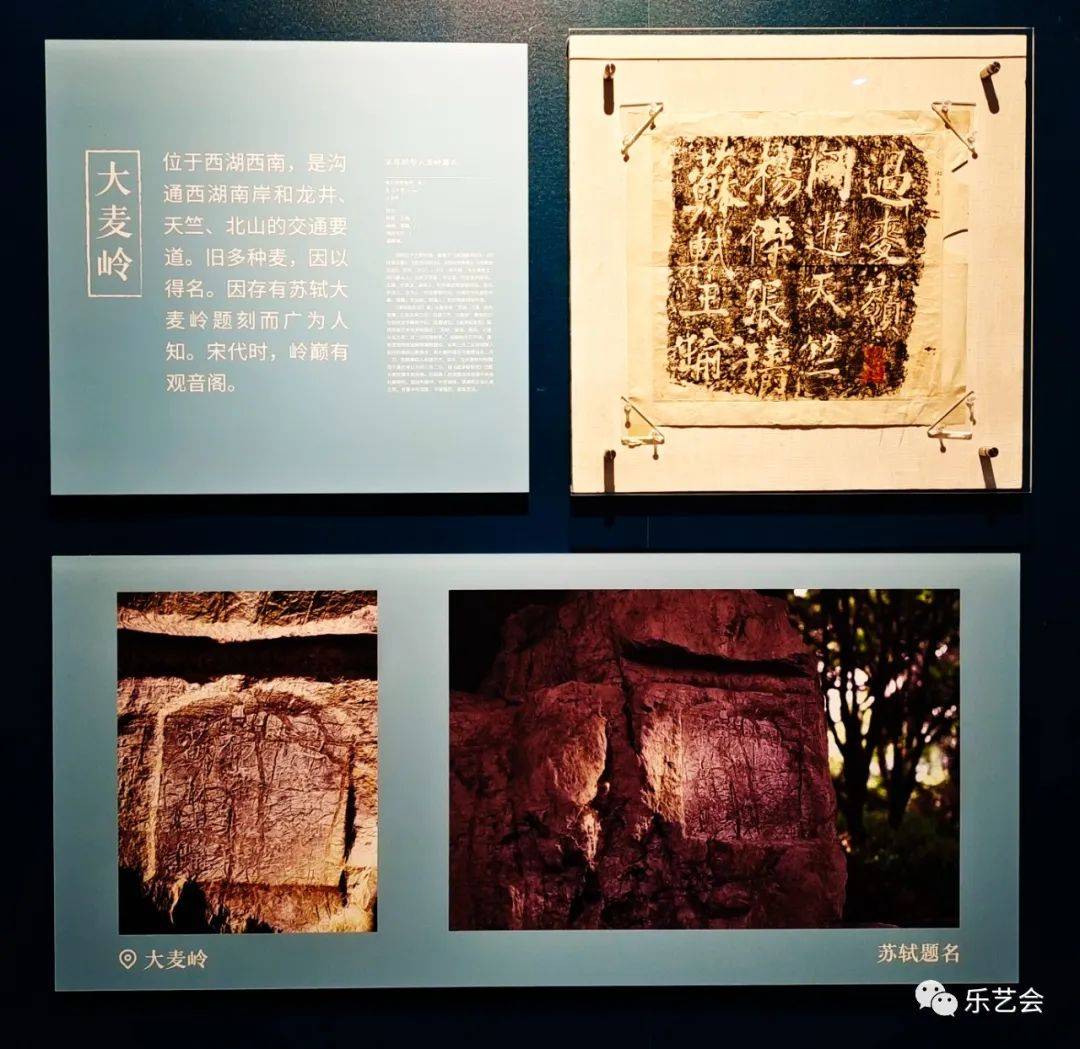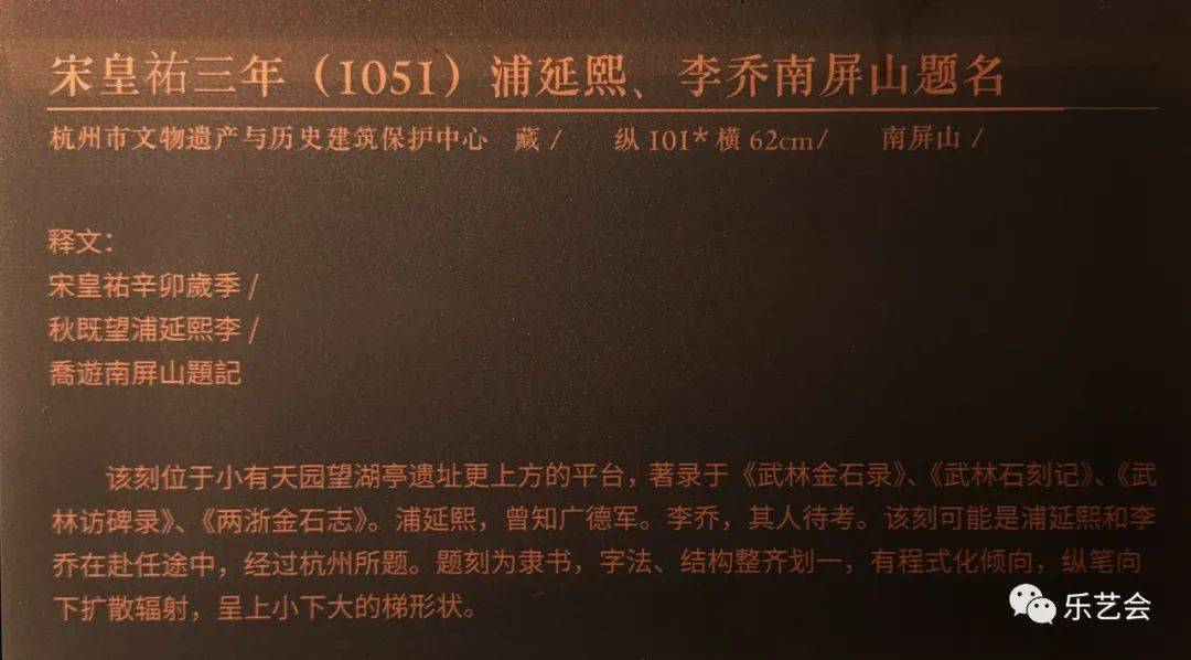 本单元展品中,宋康定元年(1040)司马池司马光南屏山题名、宋庆历二年(1042)苏舜钦等南屏山题名、宋皇祐三年(1051)浦延熙李乔南屏山题名、清乾隆帝乙酉年(1765)小有天园诗、清阮元“荔峰”榜书等数十处题刻,大部分为首次展出。吴越宝大元年(924)钱镠开慈云岭路记、吴越文穆王钱元瓘神道碑、明万历三十年(1602)孙隆烟霞洞题诗、明万历三十七年(1609)董其昌书永明塔碑等题刻的原石已毁,为珍贵的存世孤本。