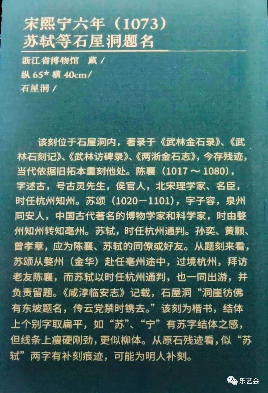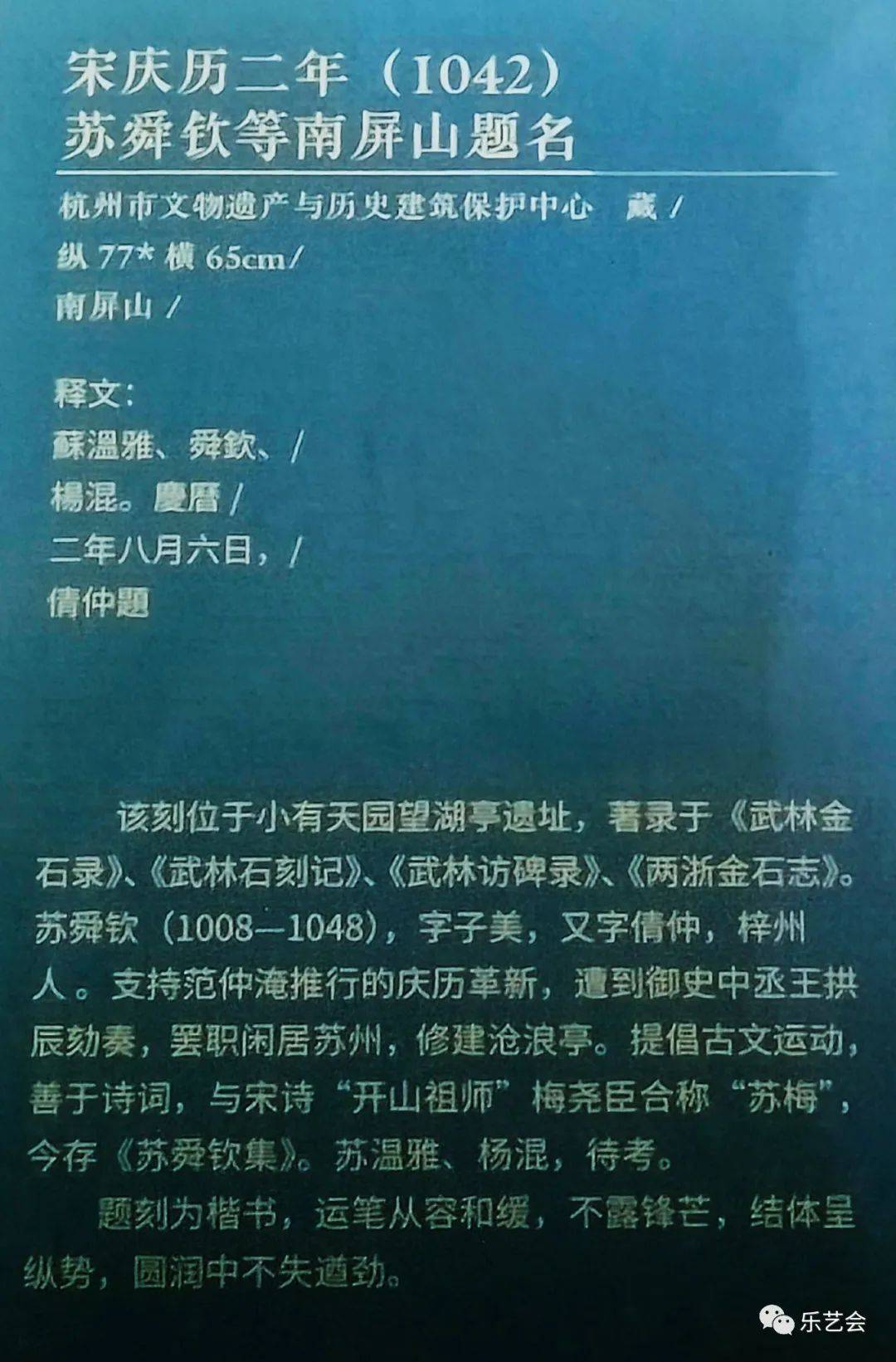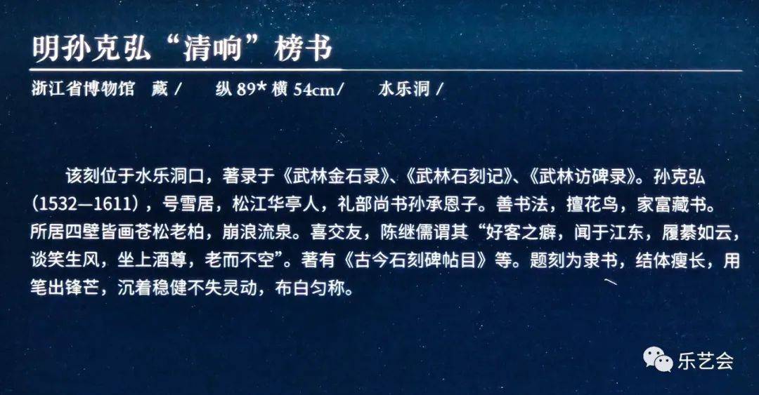 本单元展品中,宋康定元年(1040)司马池司马光南屏山题名、宋庆历二年(1042)苏舜钦等南屏山题名、宋皇祐三年(1051)浦延熙李乔南屏山题名、清乾隆帝乙酉年(1765)小有天园诗、清阮元“荔峰”榜书等数十处题刻,大部分为首次展出。吴越宝大元年(924)钱镠开慈云岭路记、吴越文穆王钱元瓘神道碑、明万历三十年(1602)孙隆烟霞洞题诗、明万历三十七年(1609)董其昌书永明塔碑等题刻的原石已毁,为珍贵的存世孤本。