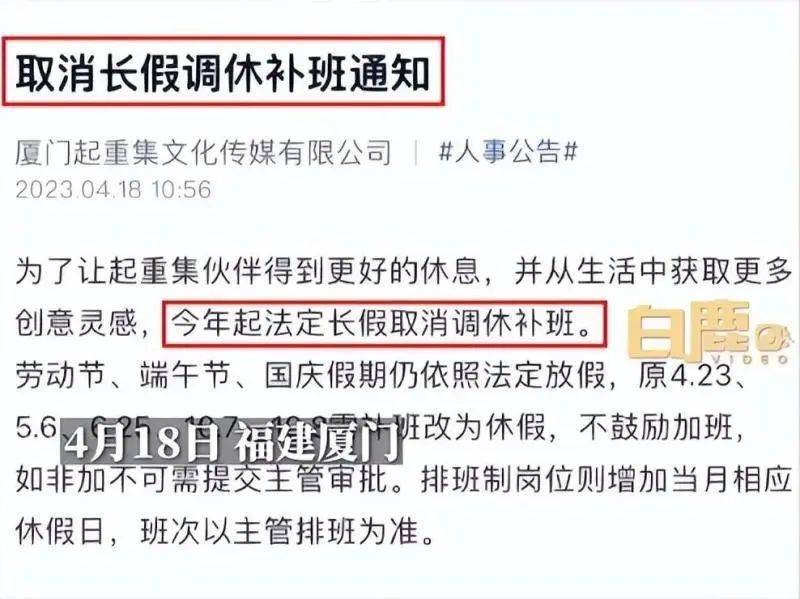 据了解,该公司在福建厦门,18日上午发布通知,今年起法定长假取消调休补班,补班改为休假,不鼓励加班。