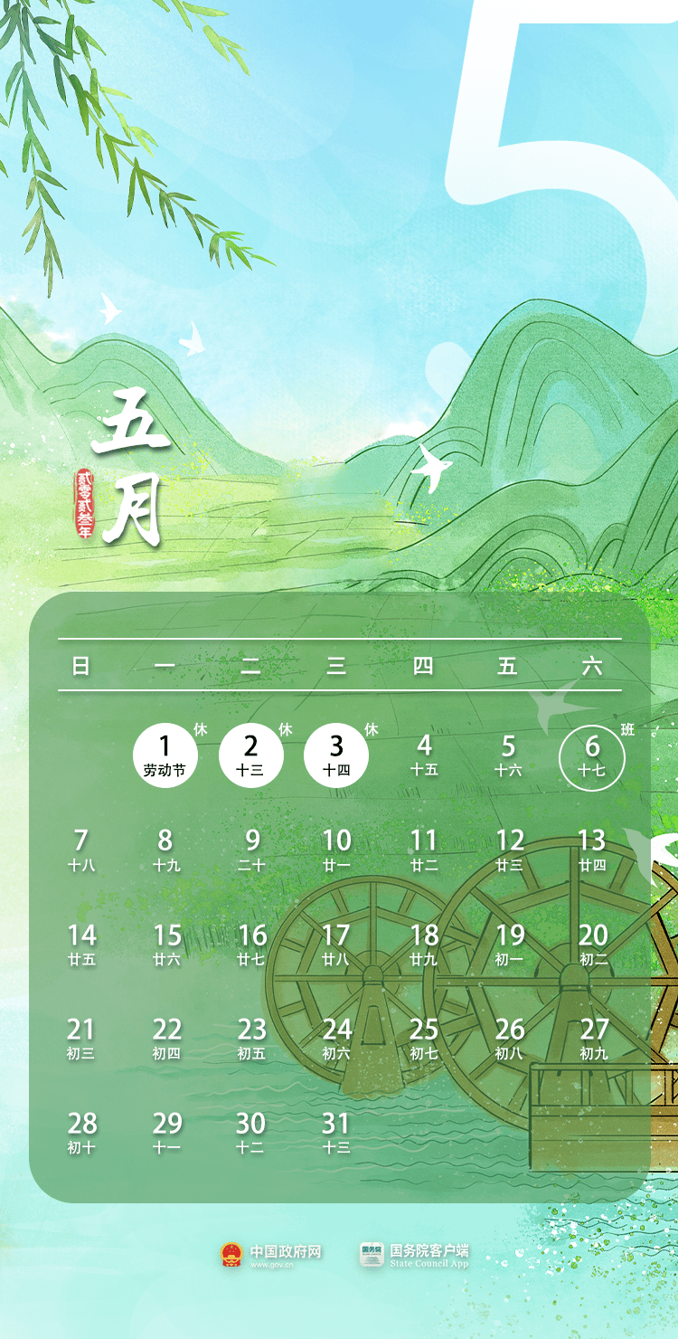 今年“五一”假期4月29日至5月3日放假调休,共5天,4月23日(星期日)5月6日(星期六)需要上班。