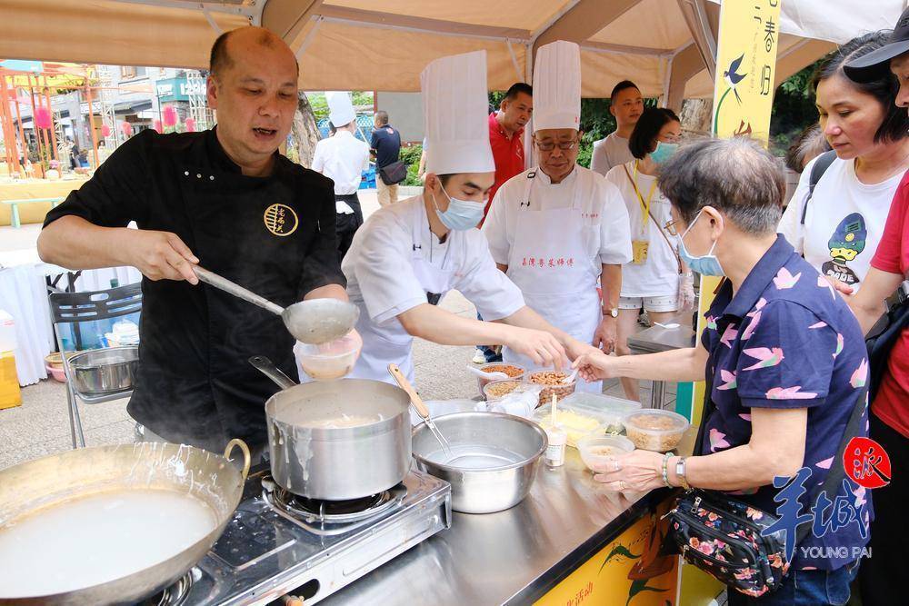 西关礼饼制作技艺区级非遗传承人、广州西关赞记礼饼铺店负责人谢颖春准备了200多份艾糍到现场免费派发给街坊。谢颖春说:“今天特意准备了应节食品——艾糍,其中馅料经过特别处理,将砂糖融入白芝麻、黑芝麻、花生,吃的时候馅料不会散,也不会腻。而艾糍的皮则用了春季当造的艾叶加米浆面粉制成,口感回甘、香糯。”