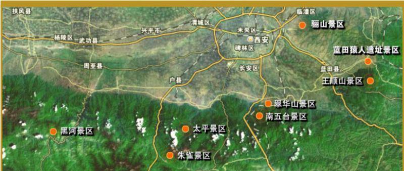 秦岭终南山世界地质公园绵延百里,孕育着无数震惊世人的自然奇观:集秀峰、异石、幽石、清流、飞泉、奇洞、天池、寺观、层林、古道于一体。沿着秦岭北坡环山旅游带,分布着公园翠华山、南五台、黑河、太平、朱雀、王顺山、蓝田猿人遗址和华清宫8个景区,就像是一条丝带上八颗闪光的珍珠。