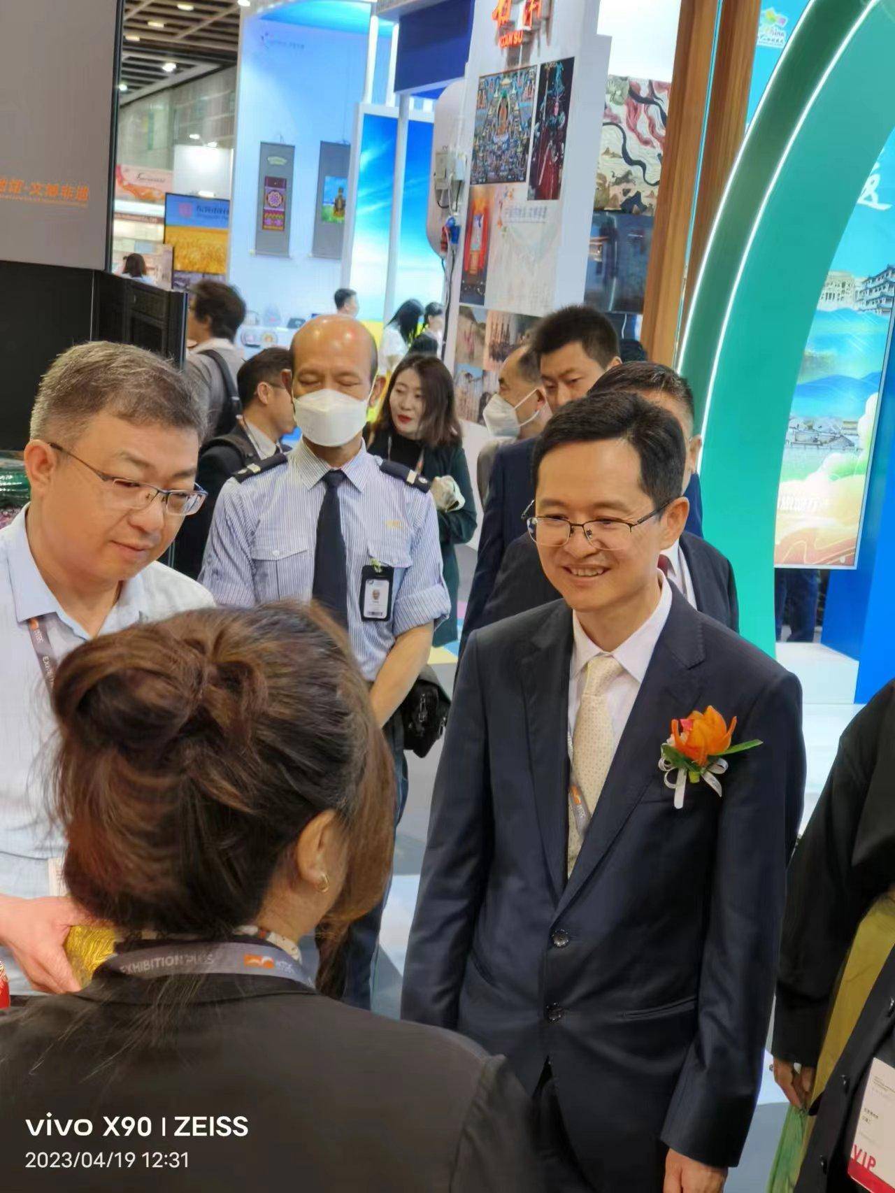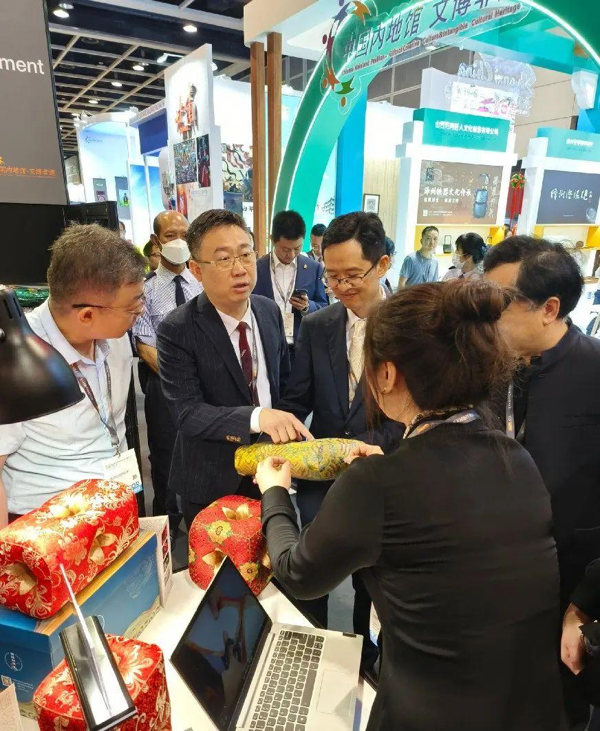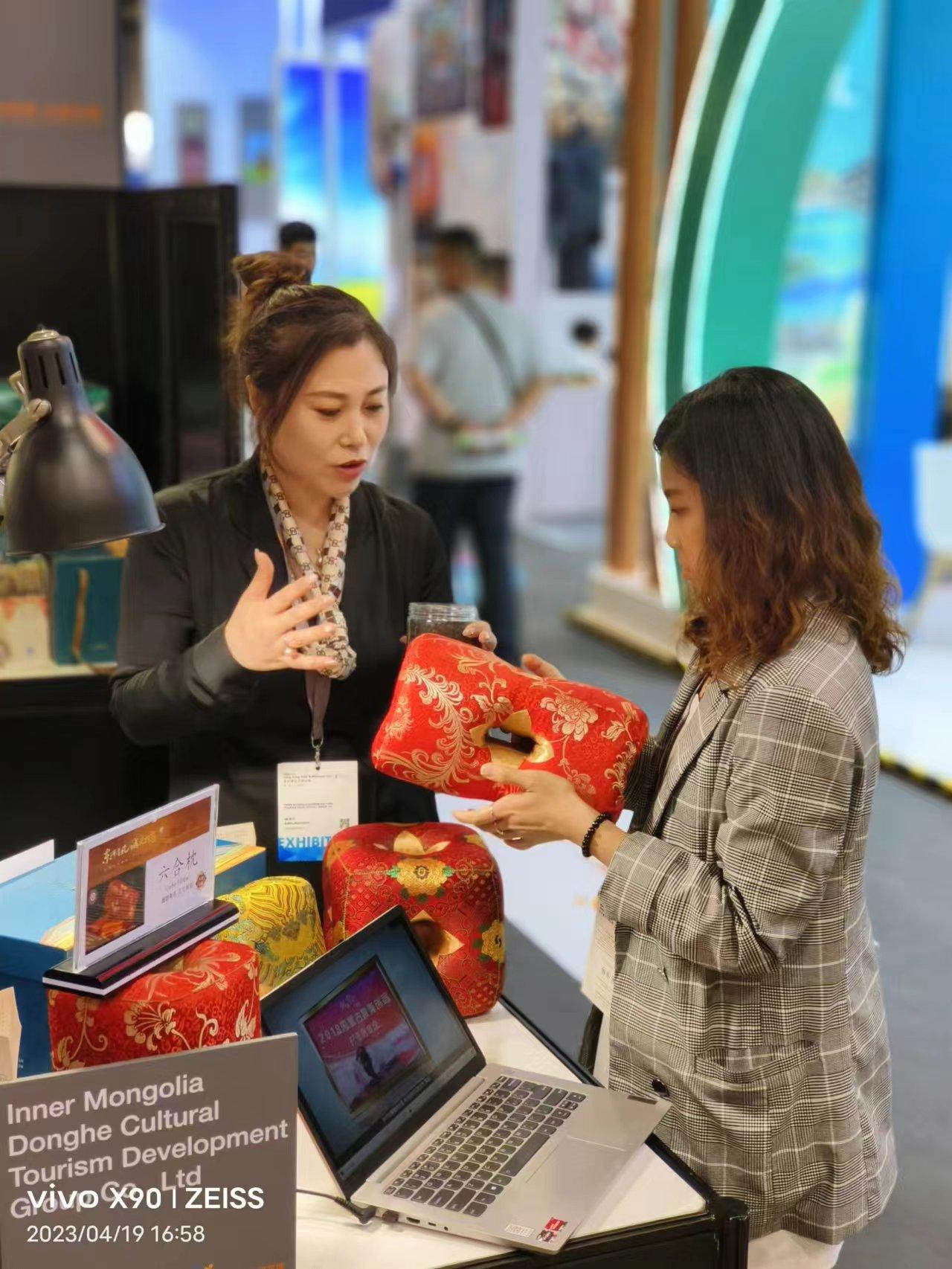 展会现场中外观展人员众多,纷纷驻足东河区展位前,了解观赏东河区独特文旅产品。六合御枕、草原人家传统羊脂皂、施跃进剪纸、德记糖果庄、徐氏杏干等一个个极具地方和民族特色的非遗展台,充分展现了东河区非遗产品的独特魅力。文旅部港澳台办副主任孔伦、中传集团党委书记、董事长兼中国文化报社社长刘强、香港贸发局副总裁张淑芬、亚洲旅游交流中心主任张栋等领导对我区特色鲜明的展陈、琳琅满目的产品赞不绝口。