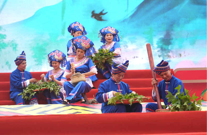 表演传统技艺:制作五色糯米饭。马鑫摄