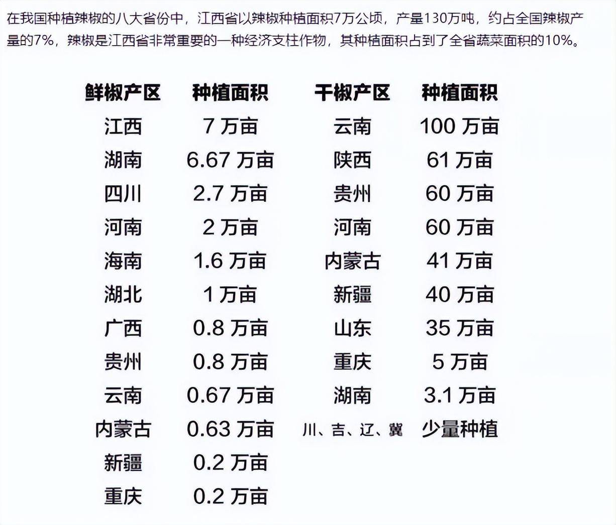 江西人的无辣不欢,从这张表里可见一斑,全国种植辣椒面积排名,江西省以7万亩位居全国第一!超过了湖南、四川、贵州等南方省份。
