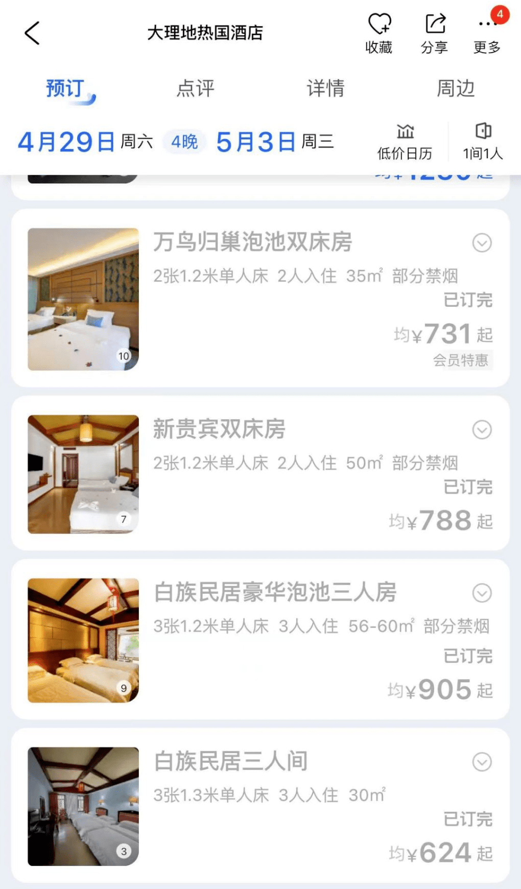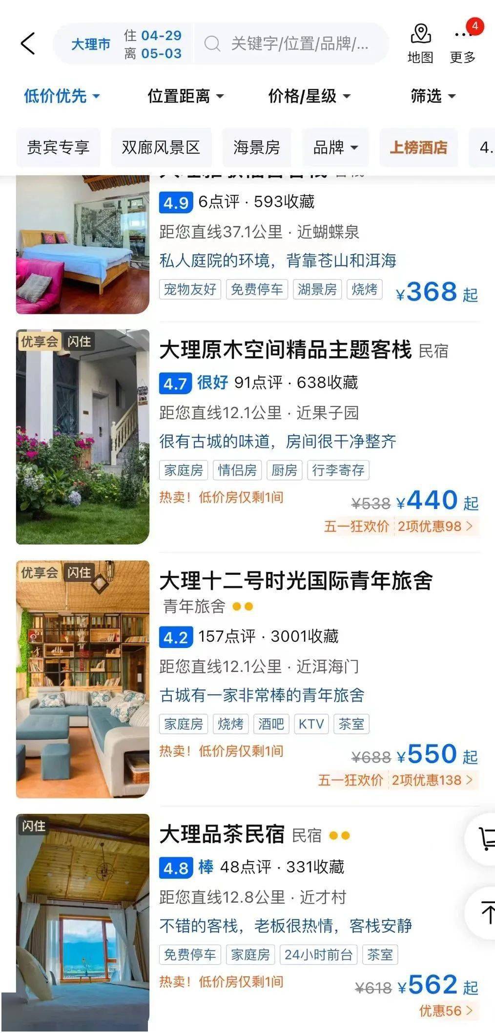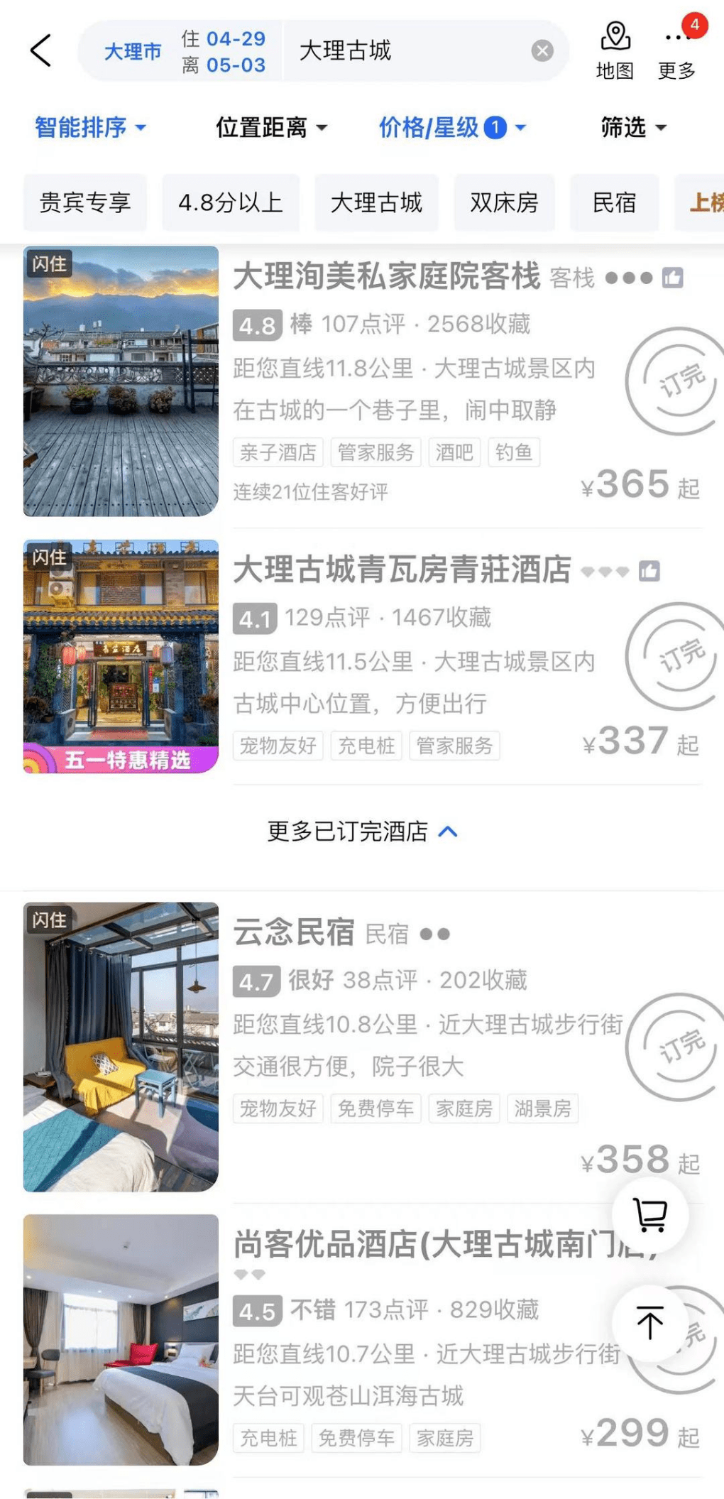 小编通过“携程旅行”平台输入关键词搜索,4月29日到5月3日期间大理地热国、大理古城、双廊等热门景点景区附近酒店客栈有的已全部满房,有的则是部分房型“已订完”。
