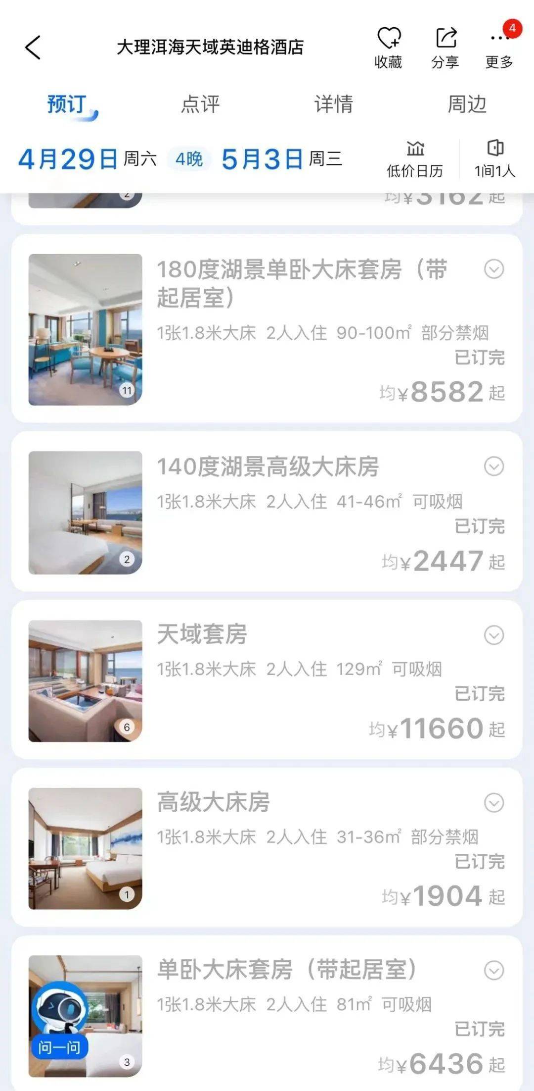 在“携程旅行”平台,小编看到大理洱海天域英迪格酒店排行到大理白族自治州豪华酒店榜No.1,其中一些万元房型也一订而空。 但是对于大家的“订房难”的担忧,小编觉得也不必太担心,目前从“携程旅行”、“美团”、“飞猪”等多个线上订房平台看,大部分酒店客栈依然有很多空房,不过小编建议五一出行前最好还是提前预定好房间。