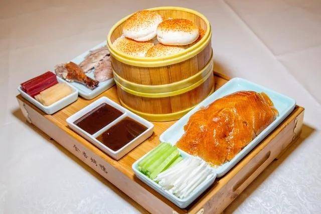 而食用北京烤鸭的时候,最好的享受方式就是将鸭子皮薄脂厚的一层撕开,裹上薄饼、葱段、黄瓜丝等配菜,再蘸上甜面酱或者糖醋酱,一口咬下去,汁水四溢,绝对是一种难以言表的美妙感觉。