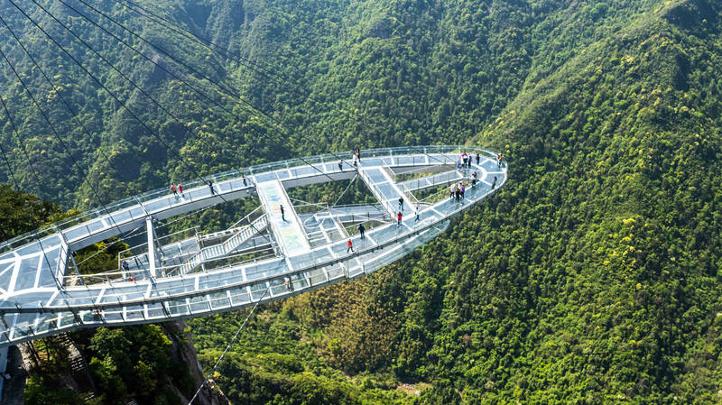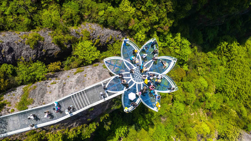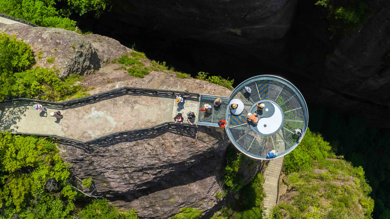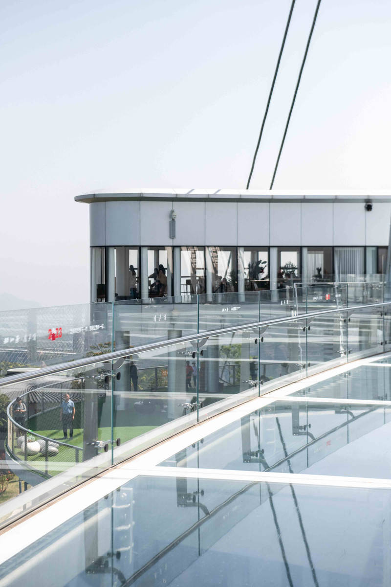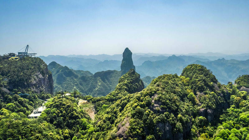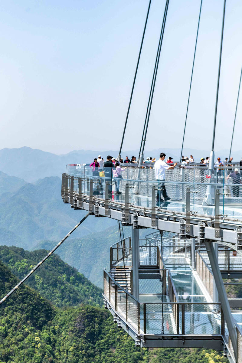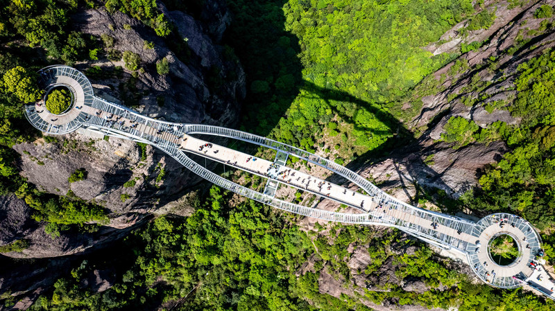 神仙居景区分为南海、北海两块,从南北两侧都可以上山,推荐从南天索道上山。南天索道是单线循环脱挂抱索器八人吊厢索道,运力高,可以少排会队,5分钟就能抵达山顶。上山后乘坐电梯在步行10分钟左右便抵达了南天顶。“来到神仙居,必游南天顶”,南天顶是最适合眺望整个景区的观景点,它是玻璃观景平台,外形好似一搜即将远航的游轮,唯美壮观,悬在海拔869米的悬崖峭壁之上,往下看就能看到山涧峭壁,真可谓是“步步惊心”。在起雾的日子里,这座观景台宛如直耸云天,漫步其中也仿佛进入了仙境中,就连向下俯视万丈深渊也需要仗着胆子了。站在南天顶顶上,面前一座座山峰层层叠叠,或庞大稳重,屹立不倒;或壁如刀削,直耸云端。山与山之间似断非断,连绵起伏相对而立,繁盛茂密的绿色植被铺满了一座座山峰,像极了仙人所居之地。