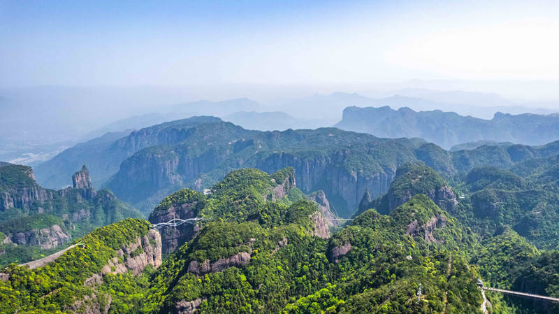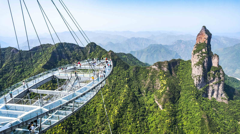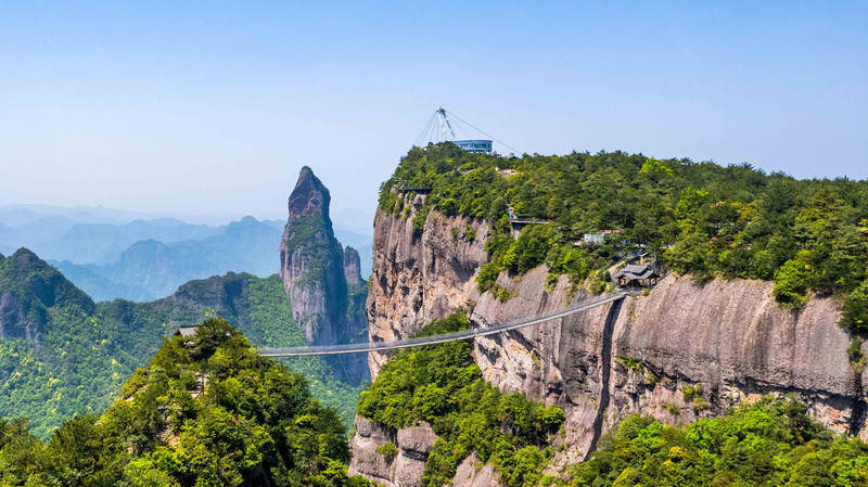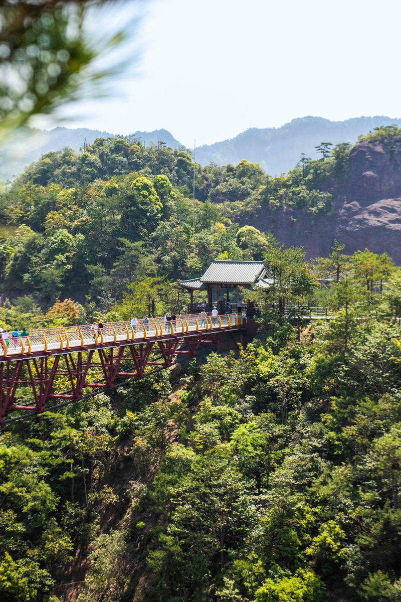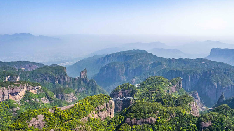 游览完南天顶,原路返回到南天索道的另一侧前往后面的几个景点,于悬崖栈道之上绕山而行,走走停停,只觉舒心畅意。眼前满是青山绿水的旖旎风光,浑身上下都被满满的负氧离子环绕着,在沿途会经过几处高空景观索桥,圆梦桥是修建在悬崖峭壁上的桥梁,共有一百二十米长,从百米高的悬崖上一桥穿山,将神仙居的南北两部分连在一起,看起来很是壮观。行走在桥面上,有一种被吓破了胆的刺激,也会有一种从高处俯瞰大地的壮观感。