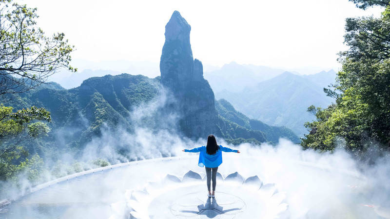 在神仙居,最不容错过的打卡点还有佛影莲韵,这里是拍摄人像的绝佳机位,站在莲花的正中心,面朝观音峰,云雾散落在山石之上,看着云雾山石,耳边传来淡淡的佛音,宁静而悠远,给人一种禅意的美感。