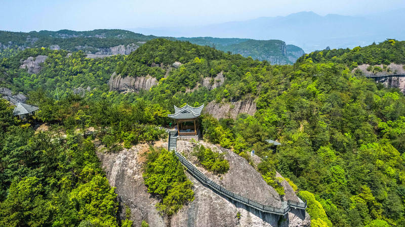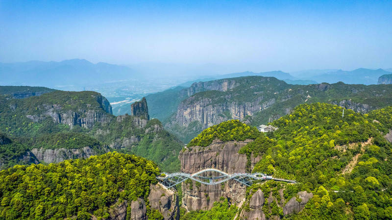 一奇览罢,又见一奇,如意桥的形状好似一个玉如意,与莲花台并称为神仙居的“人气姐妹花”,是眺望“一帆风顺”的最佳观景台,它高悬在东西两个方向上,每一个方向都相隔百米,从上往下看,它的形状就像一把“如意”,中间的部分一上一下,刚柔并济的造型和神仙居的美景完美融合,在航拍俯视的角度下如意桥像极了一只镶嵌于大地上的天空之眼,在这里远眺山峰层层叠叠,一览众山小,如果运气足够好,碰上云雾缭绕的天气,身处于如意桥之山仿佛漫步在仙境中一般。站在如意桥上,还能看到“一帆风顺”的美景。如意桥的正前方有一座山崖拔地而起,远观看起来像船帆,因此得名一帆风顺,而且从不同角度观赏会产生不一样的视觉美感,站在如意台见证一番风水,也是神仙居给游客最好的祝福。