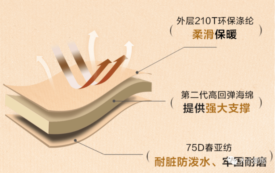 表层是柔滑保暖的环保涤纶材质,中间的高回弹海绵为身体提供强大支撑,底层是耐脏耐磨防泼水的春亚纺材质。