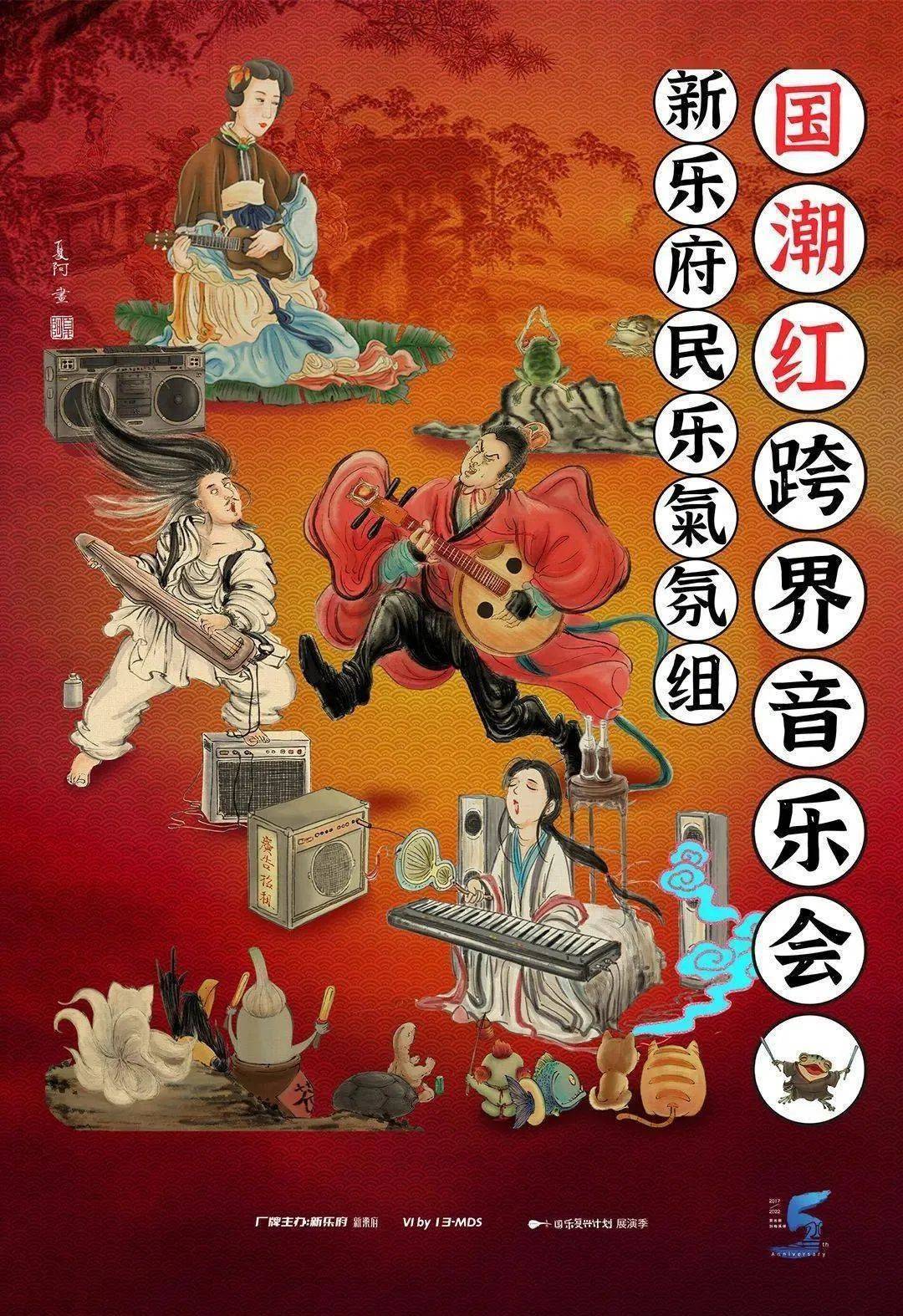 比如,在2021年成立的全新跨界民乐组合“新乐府民乐气氛组”,一支Z世代的国潮民乐队身体力行,将民乐带回民间。他们是国潮的实践者,成立短短半年就强势登陆各大非传统音乐舞台,劈出一条专属于Z世代的民乐新思路。新民气每位成员性格特异,技术过人且“一身梗”。脱口秀和顶级民乐秀无缝穿插,外加民乐知识大科普,常常演着演着,就把纯民乐演出变成一场知识点与笑点密集型演出。这样的传统民乐,Z世代怎能不欢喜?