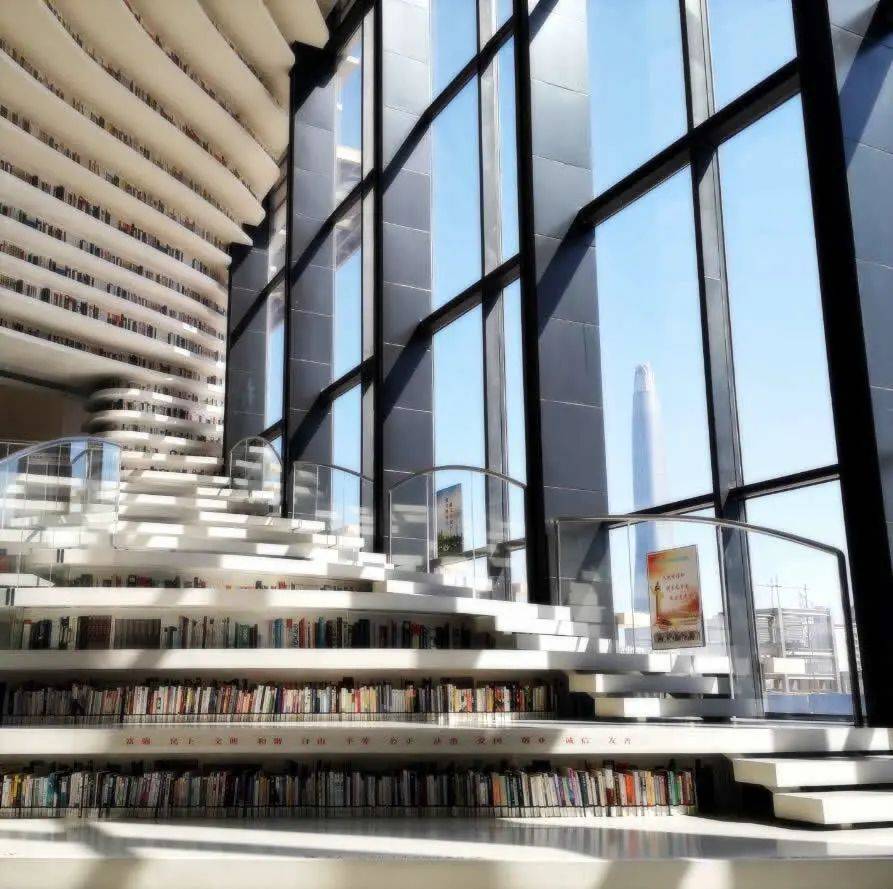 天津滨海新区的这个图书馆被誉为“滨海之眼”,其最大的亮点莫过于中庭以“书山有路勤为径”为灵感打造的书山造型。从地板到墙面,再到天花板,中庭被梯田状的落地书架完全包裹,似乎可以容纳无穷无尽的书籍,并且形成了书架、座椅、台阶三种功能,最窄的用来走路,稍宽的用来站立或停留,最宽的可以坐下来阅读。“滨海之眼”的“眼球”是一个科技感十足的球形多功能厅,配置有环绕立体声和数字放映功能。这座建筑在社交媒体上的火爆程度,已经使其成为天津一大热门“打卡地”。