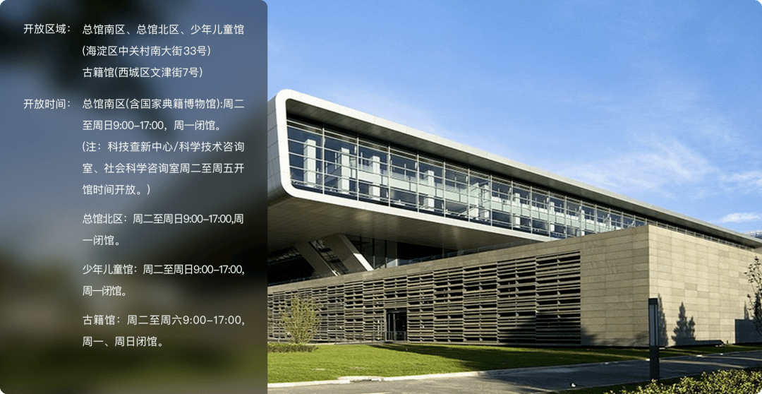 周二至周日9:30~20:00(18:00~20:00开放中心馆区一层至三层)