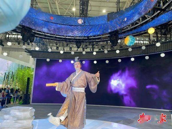在大美中国馆中心区域,巨大的曲面屏仿佛一幅流动的画卷,动态展示着我国壮丽山川与厚重人文。“华夏神州,星河璀璨。”现场演员融合周边科技装置,在声、光、影像、实体装饰物配合下,共同演绎屈原穿越千年与未来的航天员展开《天问》对话的情景,为观众打造入画式的观展感受。一颗颗大大小小的发光星球模型在头顶跃动,观众抬头仰望浩瀚宇宙,沐浴在璀璨银河之下,有一种“心向苍穹问”的气魄与浪漫。王铮说:“楚人屈原九问苍穹,上下求索,今天从这个充满想象力的情景剧中感受到跨越时空、游历古今的奇妙。”