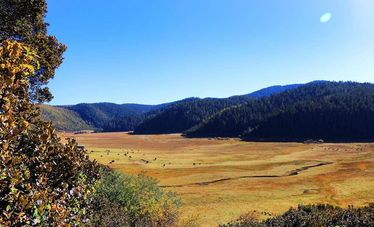 穿过一条木质的小径,来到了小中甸,在香格里拉的草原上,到处都盛开着大小不一,颜色各异的花,黄色的狼毒花,暗紫色的蝴蝶花,还有一些叫不出名字的野花,点缀着整个草原,远处的小木屋在树林里若隐若现,潺潺流水在小屋前流动,更添几分诗意,宛若仙境。放眼望去,数十只牦牛正在悠然自得地放牧,配合着四周的山水,真是一副美景!小中甸农场的对岸,是一片原始树林,树木弯曲,树枝伸入水中,构成一道“树门”,非常漂亮!这片原始丛林中,居然有黑熊,也有野兽,简直就是一片天然的自然保护区。