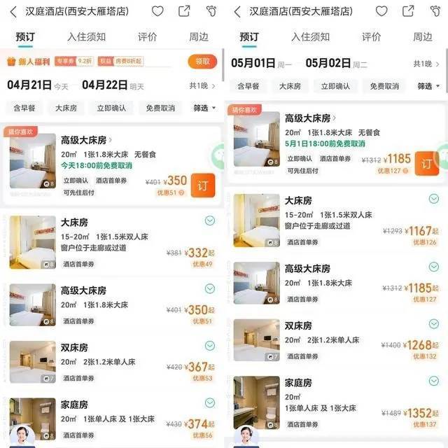 以西安为例,汉庭酒店(西安大雁塔店),4月21日入住家庭房是374元/晚,5月1日入住则变为了1352元/晚,价格上涨近千元。