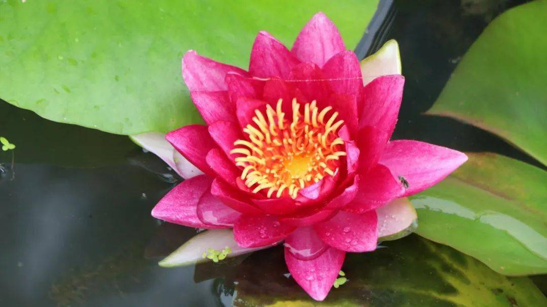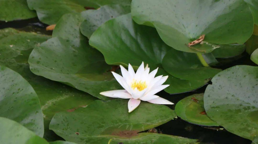 下山,到达项山村委会凌山村。经过一池塘,睡莲舒展,洁白色、粉红色的莲花娇艳绽放,在水波、涟漪和绿叶间翩翩起舞。