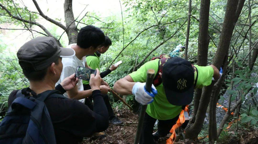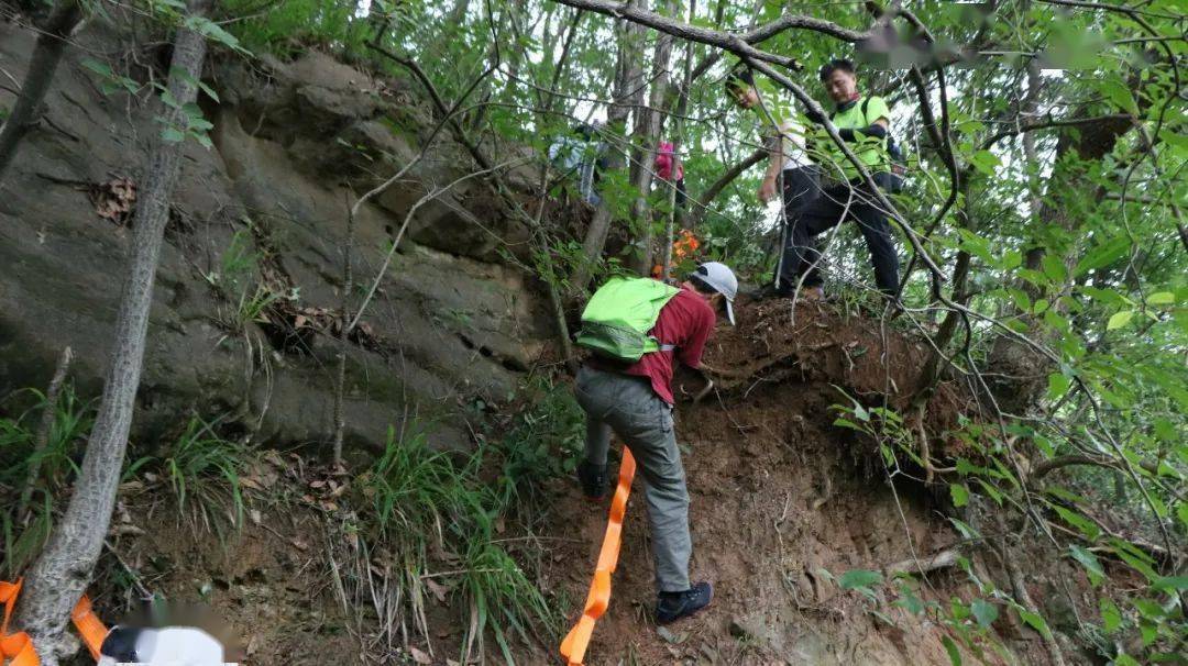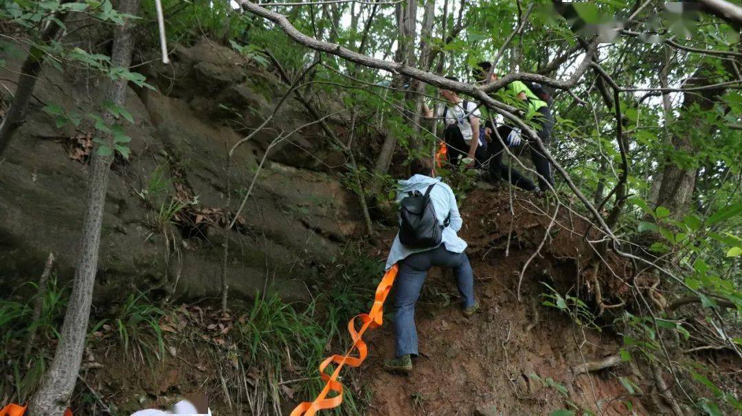 专门用于攀爬的绳索,系于两侧树木,驴友们缓缓攀爬。