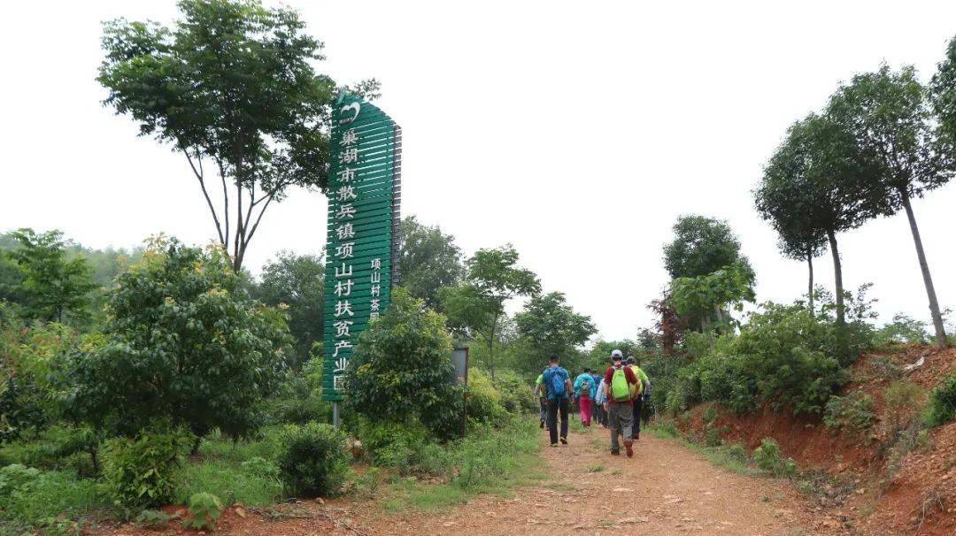 不知不觉间,驴友们来到一“山庄”和巢湖市散兵镇项山村扶贫产业园(茶园),稍作休息。