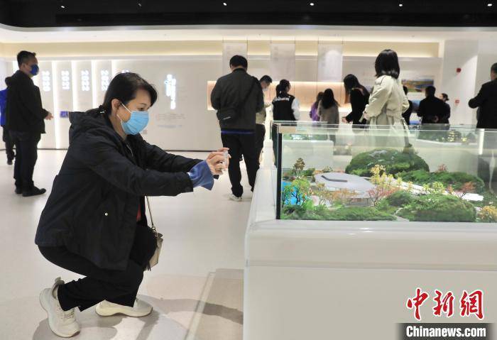 一位海外华媒代表在2024年成都世界园艺博览会主会场展示中心拍摄展出的沙盘。 王磊 摄
