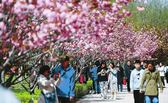 移步到太原市和平公园,栽种了关山、松月等6个品种的樱花树共800余株,市民在绽放的樱花树下赏景、拍照,惬意游园,竞相盛放的晚樱为园景增添了亮丽色彩。