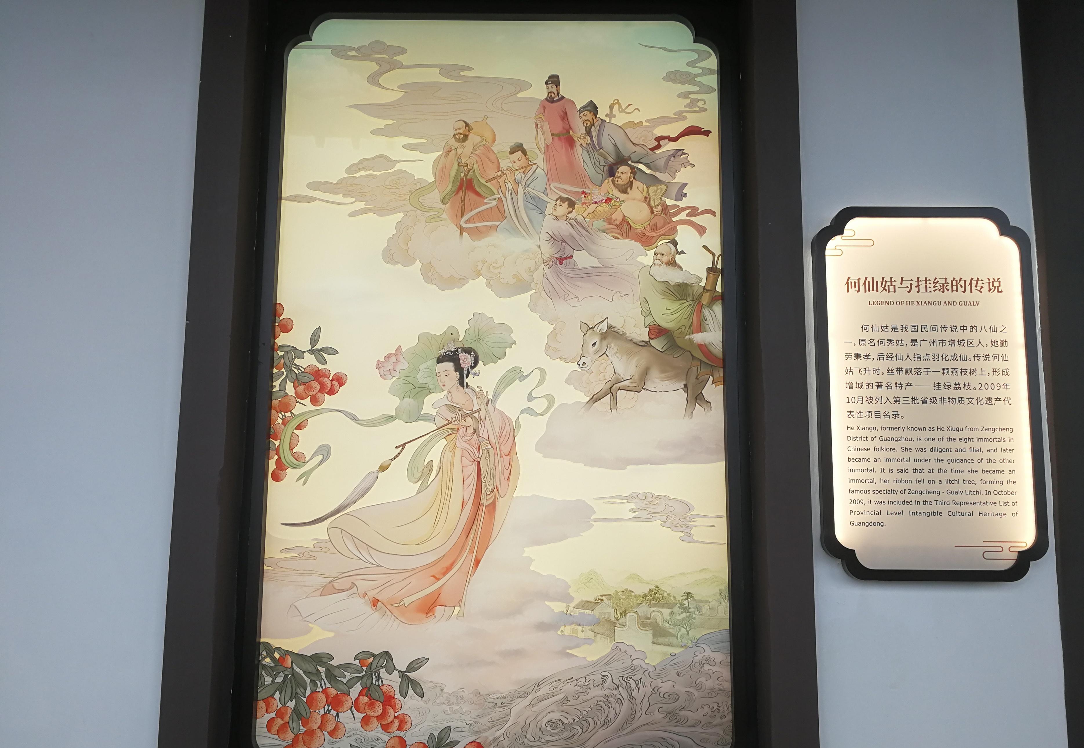 何仙姑是我国民间传说中的八仙之一,原名何秀姑,是广州市增城区人,她勤劳秉孝,后经仙人指点羽化成仙。传说何仙姑飞升时,丝带飘落于一颗荔枝树上,形成增城的著名特产---挂绿荔枝。2009年10月被列入第三批省级非物质文化遗产代表性项目名录。