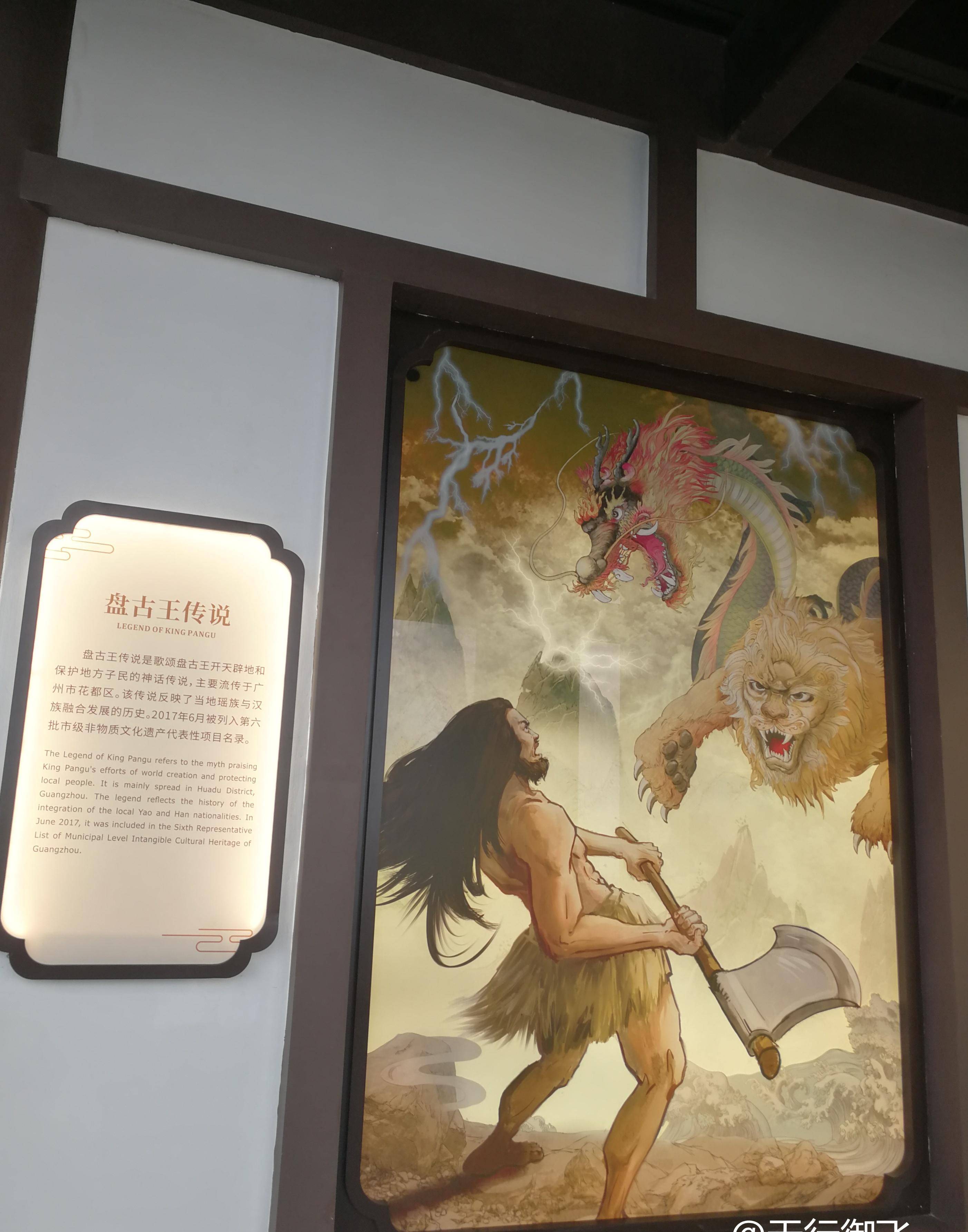 盘古王传说是歌颂盘古开天辟地和保护地方子民的神话传说,主要流传于广州市花都区。该传说反映了当地瑶族与汉族融合发展的历史。2017年6月被列入第六批市级非物质文化遗产代表性项目名录。